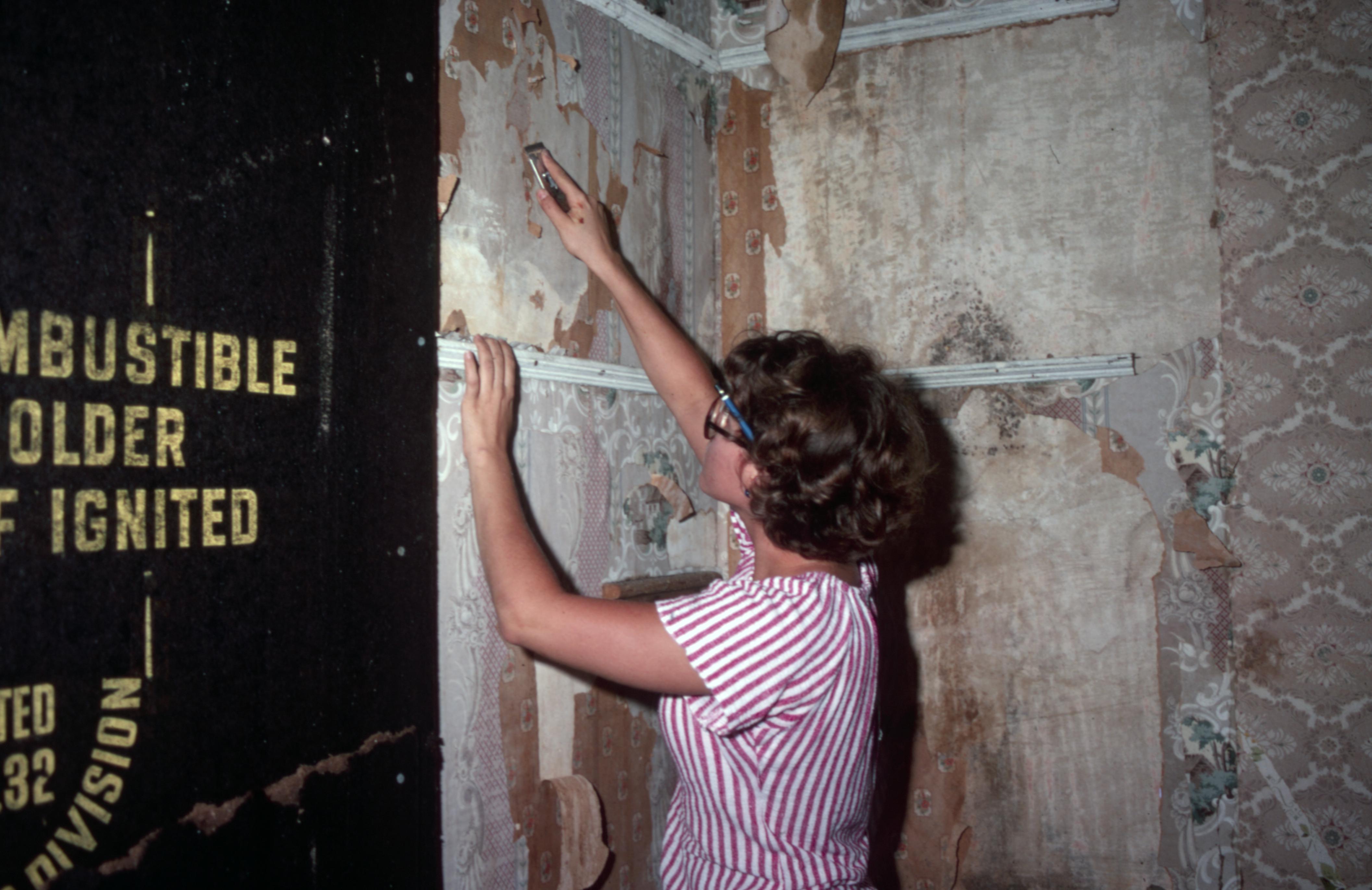 The Jaquess House: This is a photo of the Jaquess House, as it was before being dismantled, from which the parlor was taken, was moved from somewhere near Poseyville. It was then taken through a field to near the edge of a highway where it was dismantled. The parlor was then incorporated into the Owen House on the corner of Tavern and Brewery Streets in town block 6 E east. In the photo a woman is removing old wallpaper from one of the rooms.