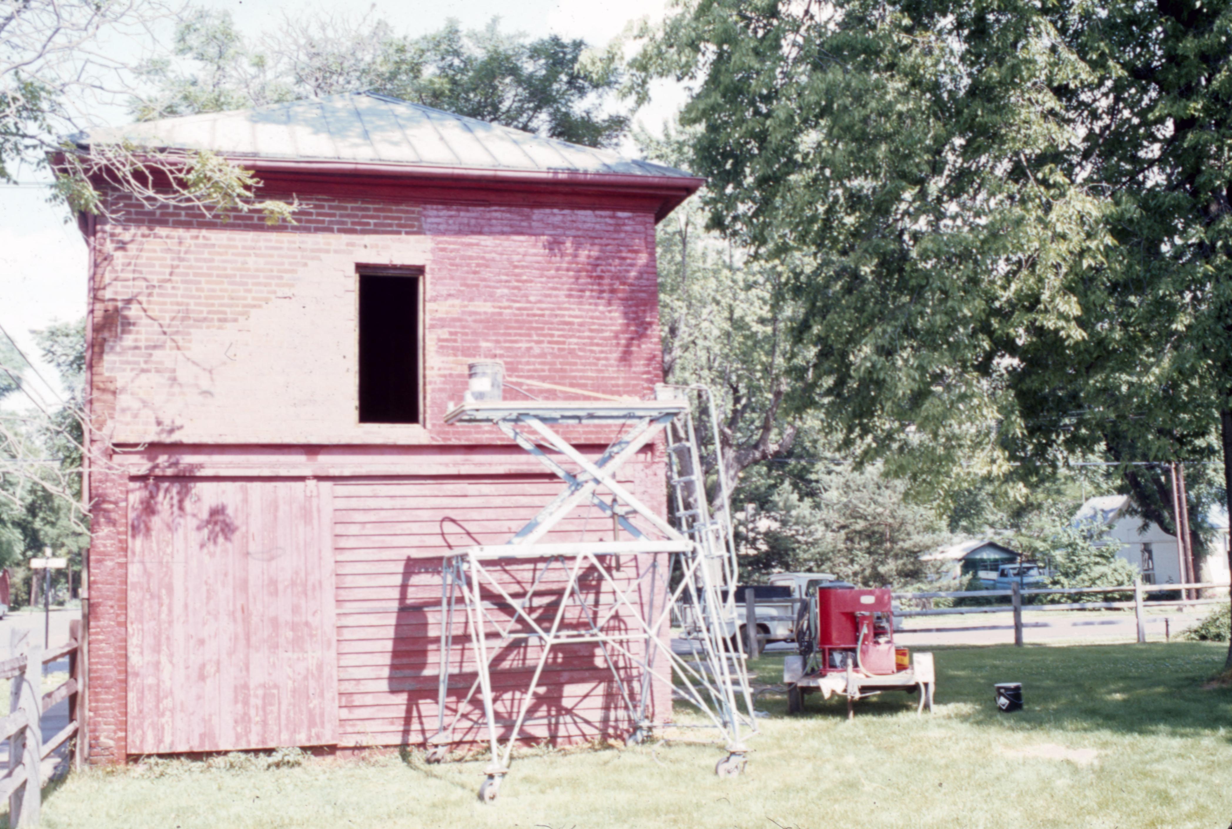 1830 Owen House: This photo is of the west side of the 1830 Owen House. Scaffolding is in place for cleaning the outside of the structure, however no workers are present.