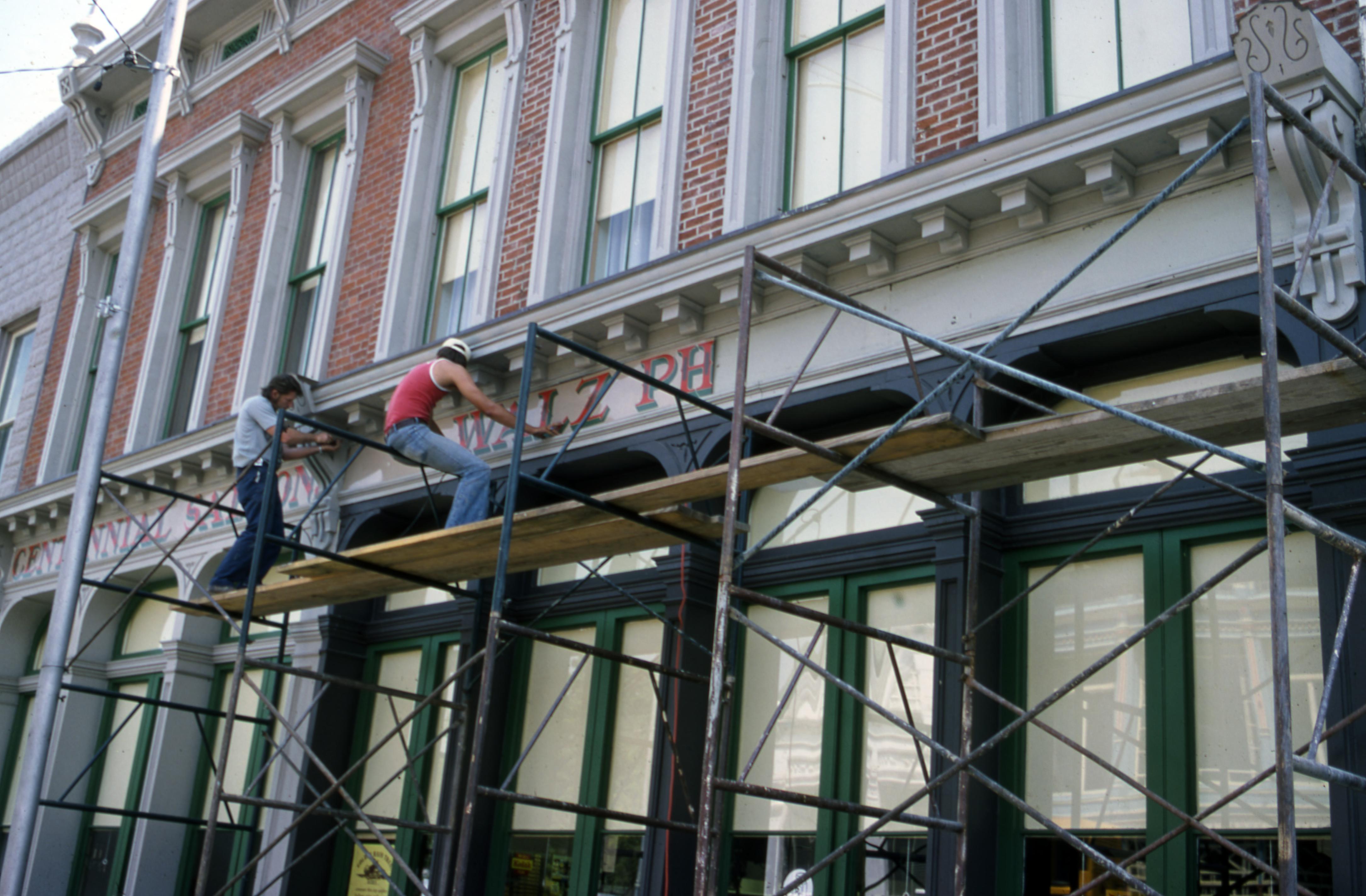 Centennial Saloon Building: This building is located at 510 Main Street. This historic brick structure was constructed before 1888 (UA58 � 7516 large brick building), most likely as the United States was celebrating its Centennial (100 year) Anniversary in 1876. The plat itself, along with the adjacent plat to the south, had belonged to William Baldwin, according to the 1869 New Harmony Plat Map. Heart of Harmony Antiques shop was located in the building in the early 1970s (UA58 � 7604 right side). Indiana Bell Telephone Exchange and office was located on the second floor of the building by 1907. It had previously been located next door on the second floor of the Heckman Building in the late 1890s (UA58 � 7512 near center of photo). New Harmony Tourist Lodgings office was located on the second floor in the 1970s (UA58 � 7604 far right side). In this photo two construction workers are applying the new sign above the front door, based on the original painted one.