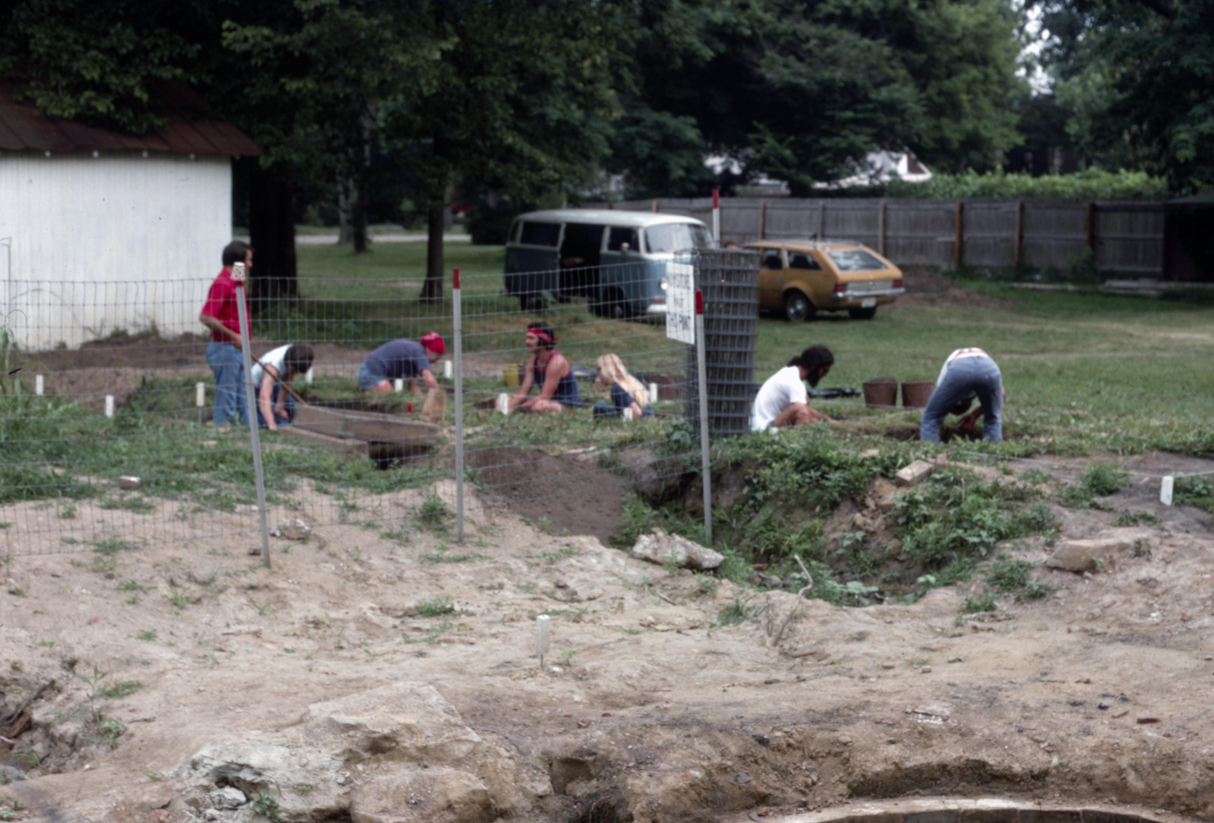 Indiana State University Evansville Archaeological Dig Collection: Solomon Wolf House. This dig site was located on South Street just east of 718 Main Street. This building was moved to 601 Granary Street for the construction of the Tree of Life Clinic. A group of people are working at the dig site.