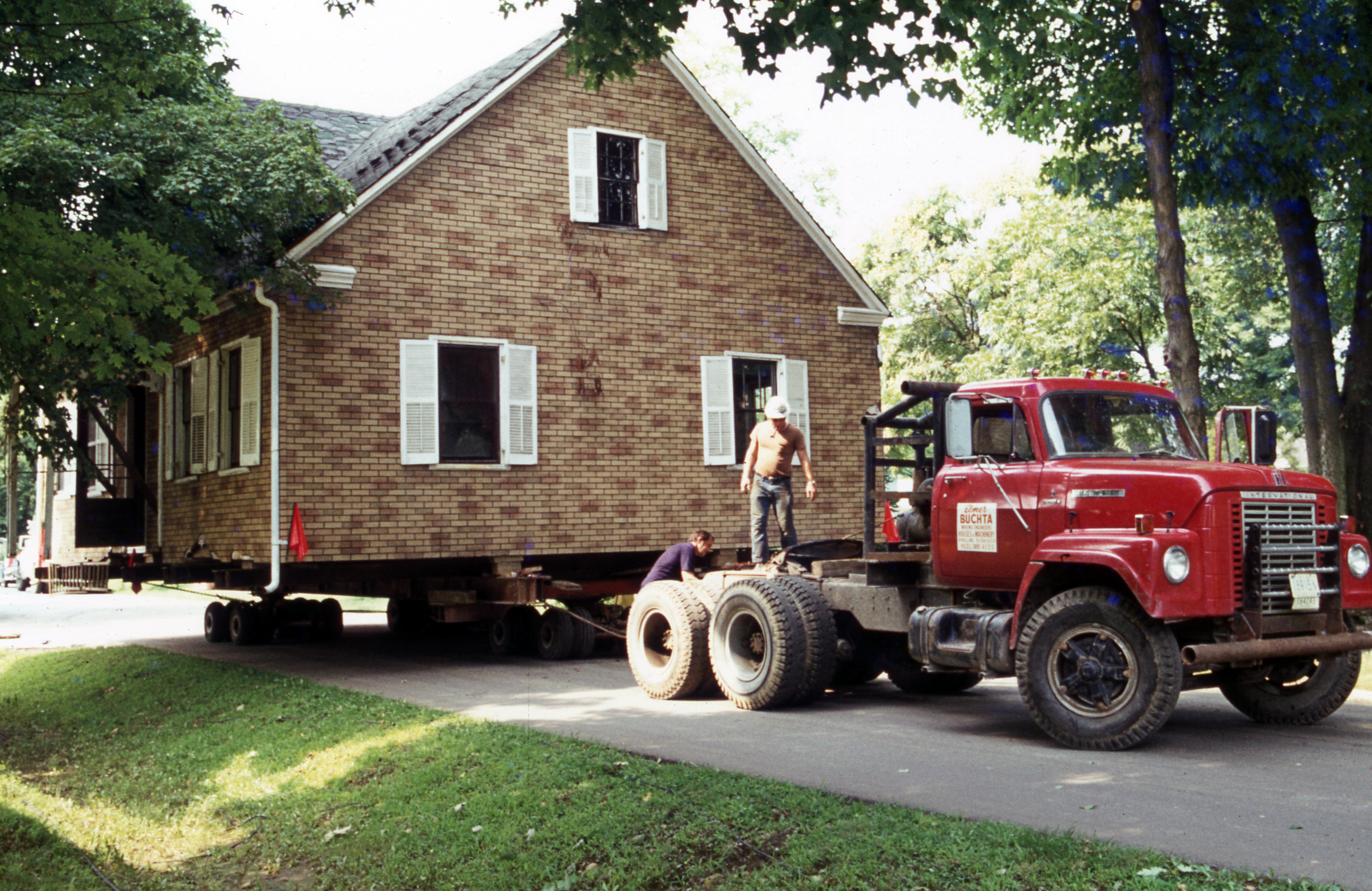 Beal House: The Beal House was moved during the Lanark Construction, on Town Block 8 E/W on Main Street to 611 Church Street. The Beal house was constructed around 1829 by John Beal, who was a carpenter in the Owen and Maclure community. Beal constructed the house from lumber and timbers from an older horse barn. The new location would be the site of the Beal House and 1850s Doctor's Office (The Doctor's Office was a remodel of the Kemmerling House, which was also moved to this site). Elmer Buchta Moving Engineers was contracted for this and many other building moves during the 1970s. In this photo the house is headed north on Brewery Street toward the new plat on Church Street.