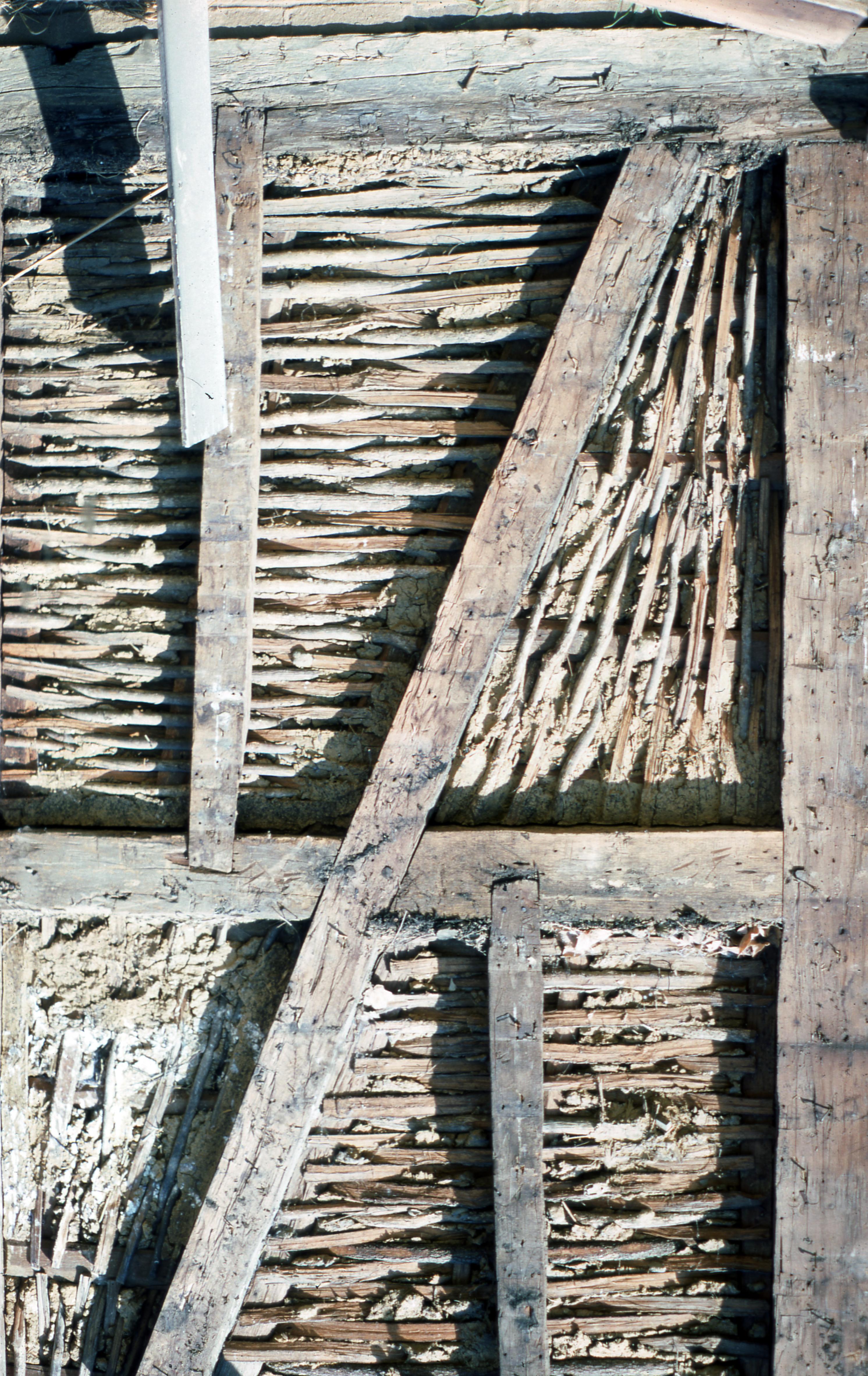 Beal House: The Beal House was moved during the Lanark Construction, on Town Block 8 E/W on Main Street to 611 Church Street. The Beal house was constructed around 1829 by John Beal, who was a carpenter in the Owen and Maclure community. Beal constructed the house from lumber and timbers from an older horse barn. The new location would be the site of the Beal House and 1850s Doctor's Office (The Doctor's Office was a remodel of the Kemmerling House, which was also moved to this site). Elmer Buchta Moving Engineers was contracted for this and many other building moves during the 1970s. This photo shows the wattle and daub filled timber frame of the Beal House.