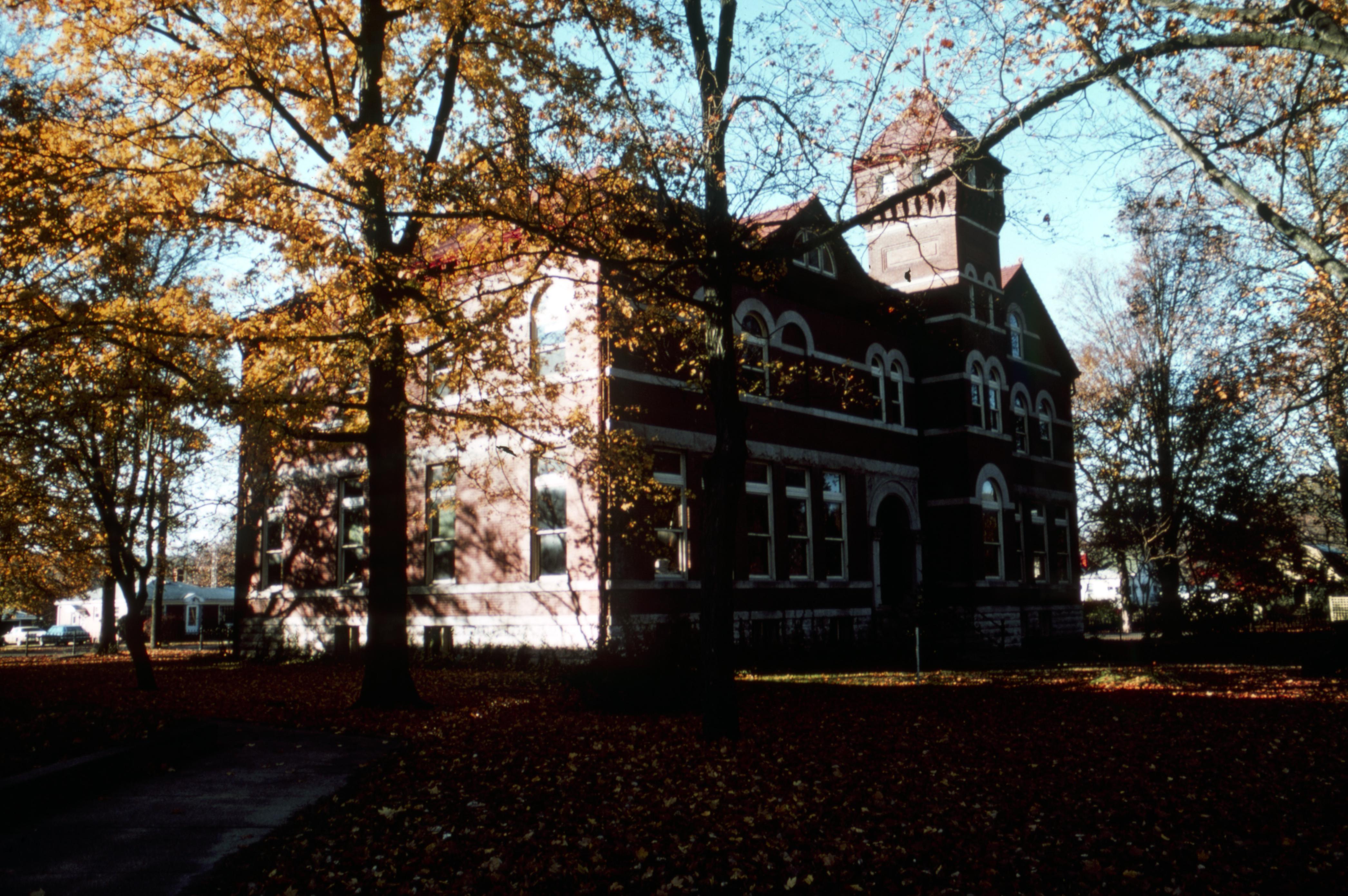 Working Men's Institute: This building is located 407 Tavern Street. The Working Men's Institute was founded in 1838, by William Maclure, as a library for working people, not just those who were wealthy. Initially there were a total of 160 Working Men's Institutes, 144 in the state of Indiana and 16 in the state of Illinois, however, the one in New Harmony Indiana is the only one which still remains. The present location of the WMI was completed in 1894, now a National Historic Landmark, before this it was housed in the old Harmonist Church from 1834 until the new building was completed. The WMI also houses a museum as well as the oldest working library in the state of Indiana. This photo is of the northeast corner of the WMI taken from Tavern Street.