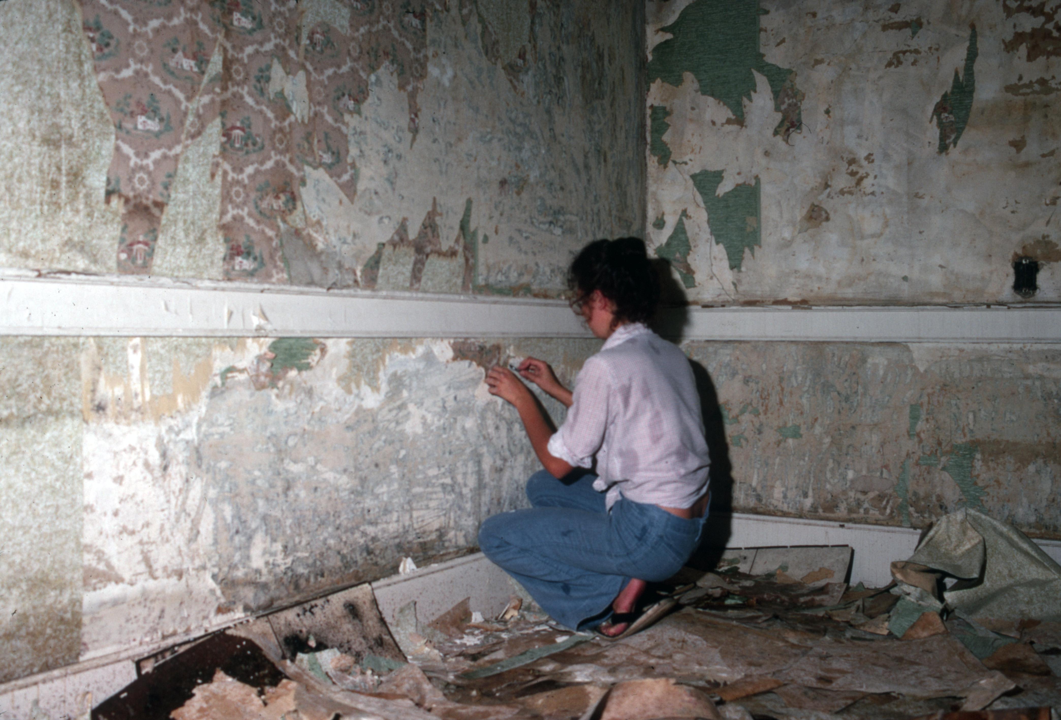 The Jaquess House: This is a photo of the Jaquess House, from which the parlor was taken, was moved from somewhere near Poseyville. It was then taken through a field to near the edge of a highway where it was dismantled. The parlor was then incorporated into the Owen House on the corner of Tavern and Brewery Streets in town block 6 E east. In this photo a woman is removing layers of wallpaper from one of the rooms.
