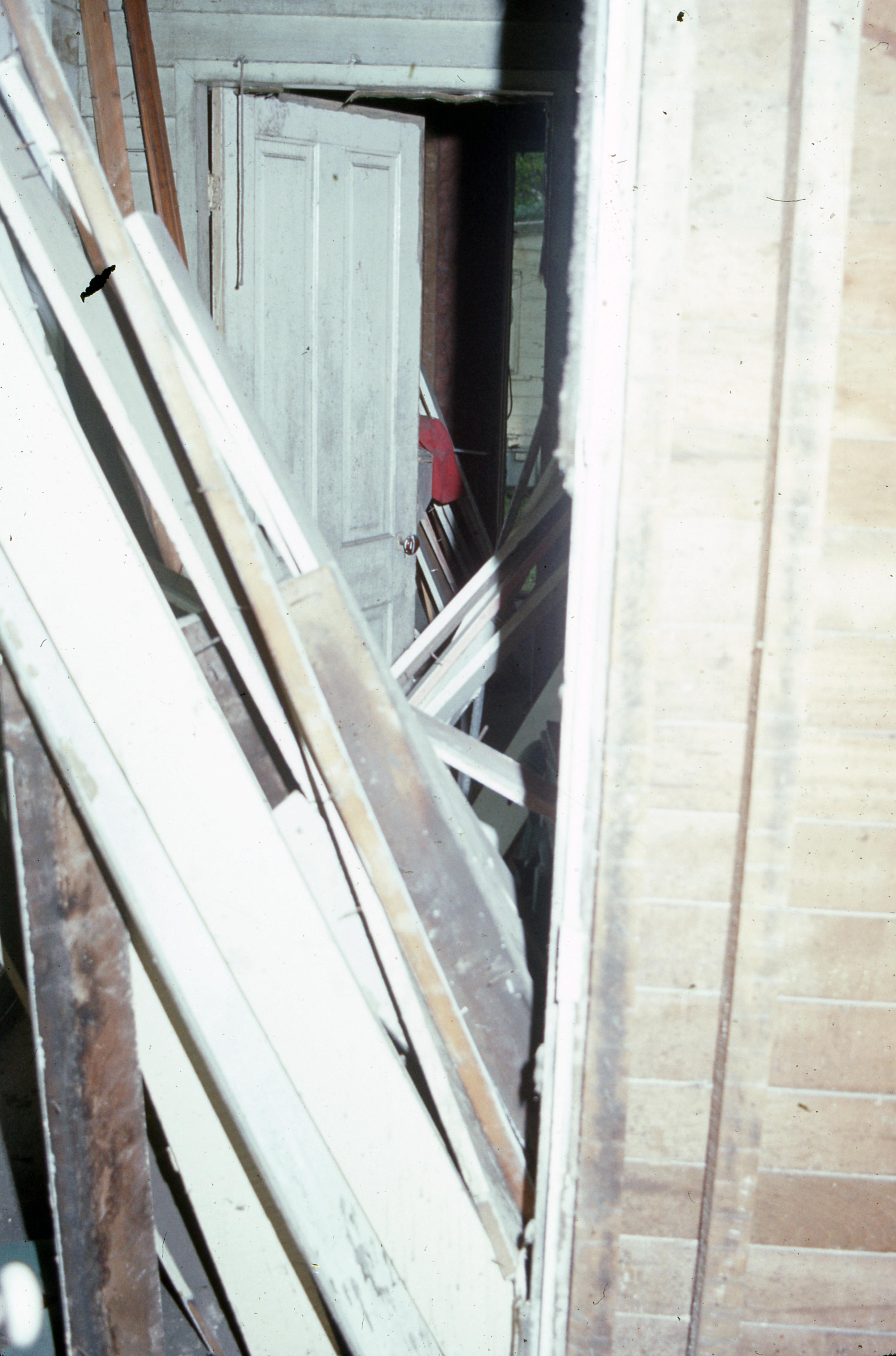 Rhodes House: This house is located at 611 Arthur Street and was present by at least 1907. The Rhodes House had sat abandoned for many years before restoration work was undertaken. This photo shows the walls which have been stripped back to the original laths and studs.