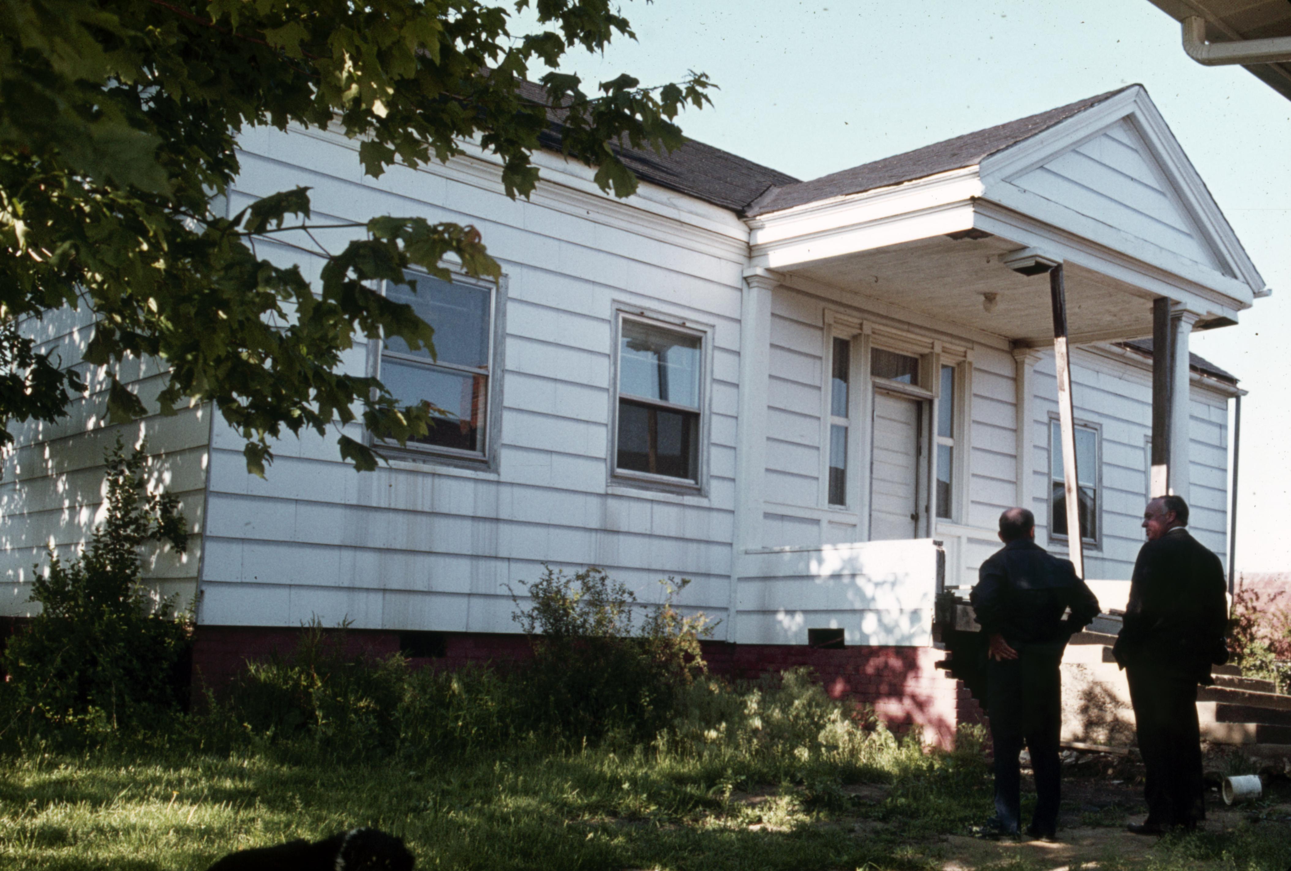 The Jaquess House: The Jaquess House was a small structure which stood in Posey County, somewhere near Poseyville. The parlor from this house was removed and relocated to become part of the 1830 Owen House in New Harmony. This is a photo of the Jaquess House, as it was before being dismantled, from which the parlor was taken, was moved from somewhere near Poseyville. It was then taken through a field to near the edge of Highway 66 where it was dismantled. The parlor was then incorporated into the Owen House on the corner of Tavern and Brewery Streets in town block 6 E east.