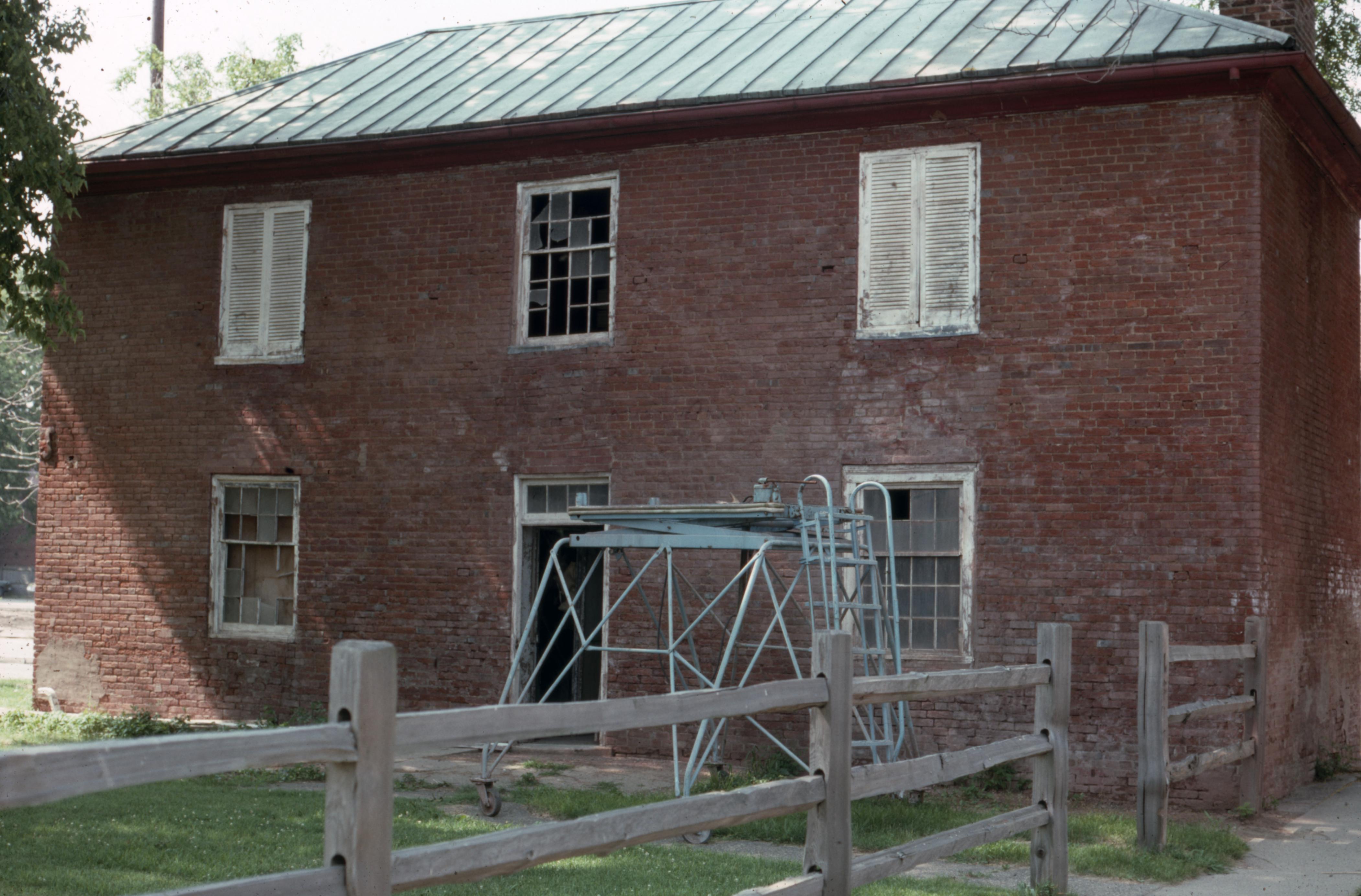 1830 Owen House: The backside of the 1830 Owen House showing broken windows and a scaffold. The house is located at 531 Tavern Street.