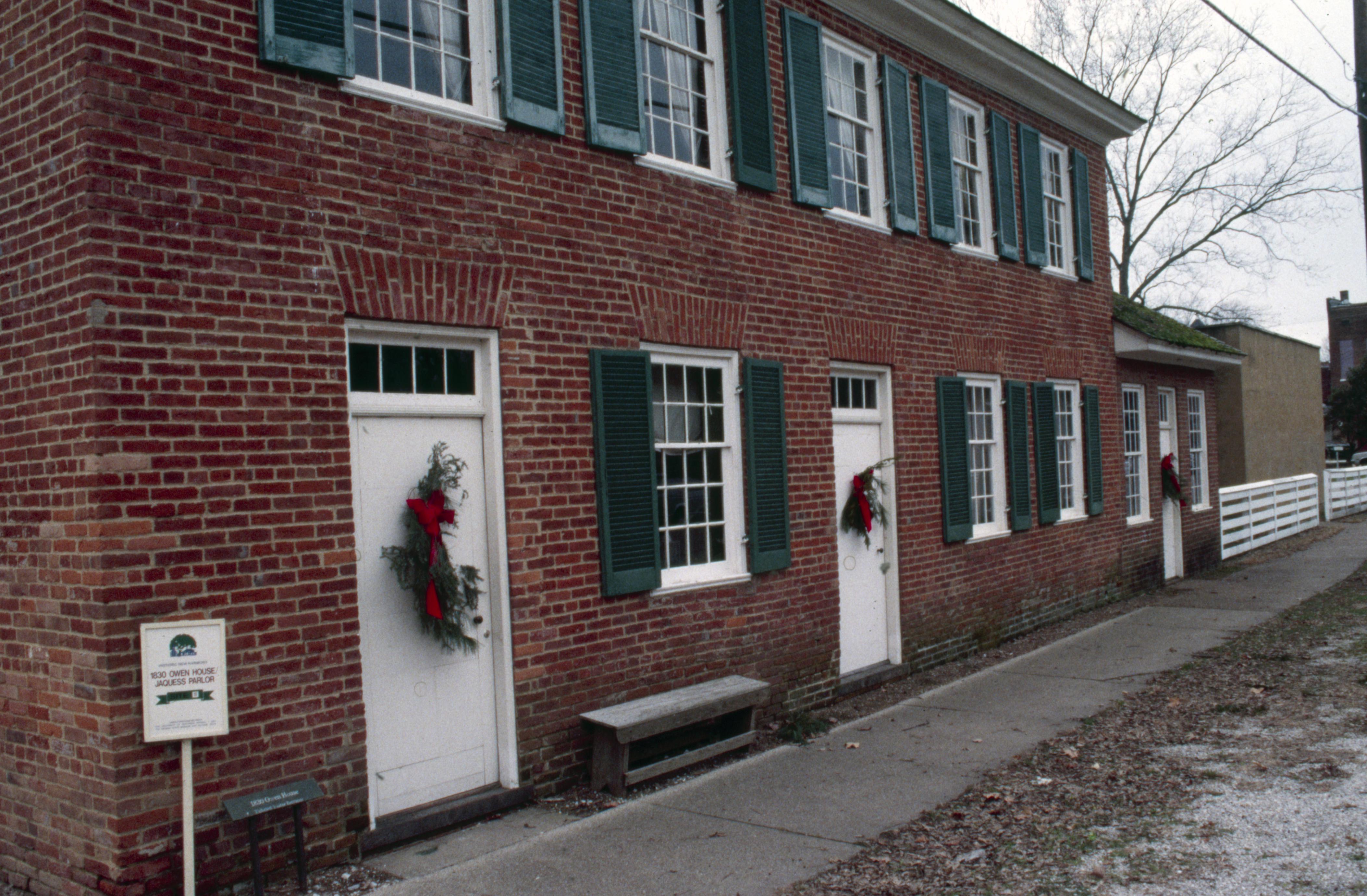 1830 Owen House: Located at 531 Tavern Street. The 1830 Owen House as decorated for Christmas. There is a sign posted by Historic New Harmony stating this is Site 11 The 1830 Owen House.