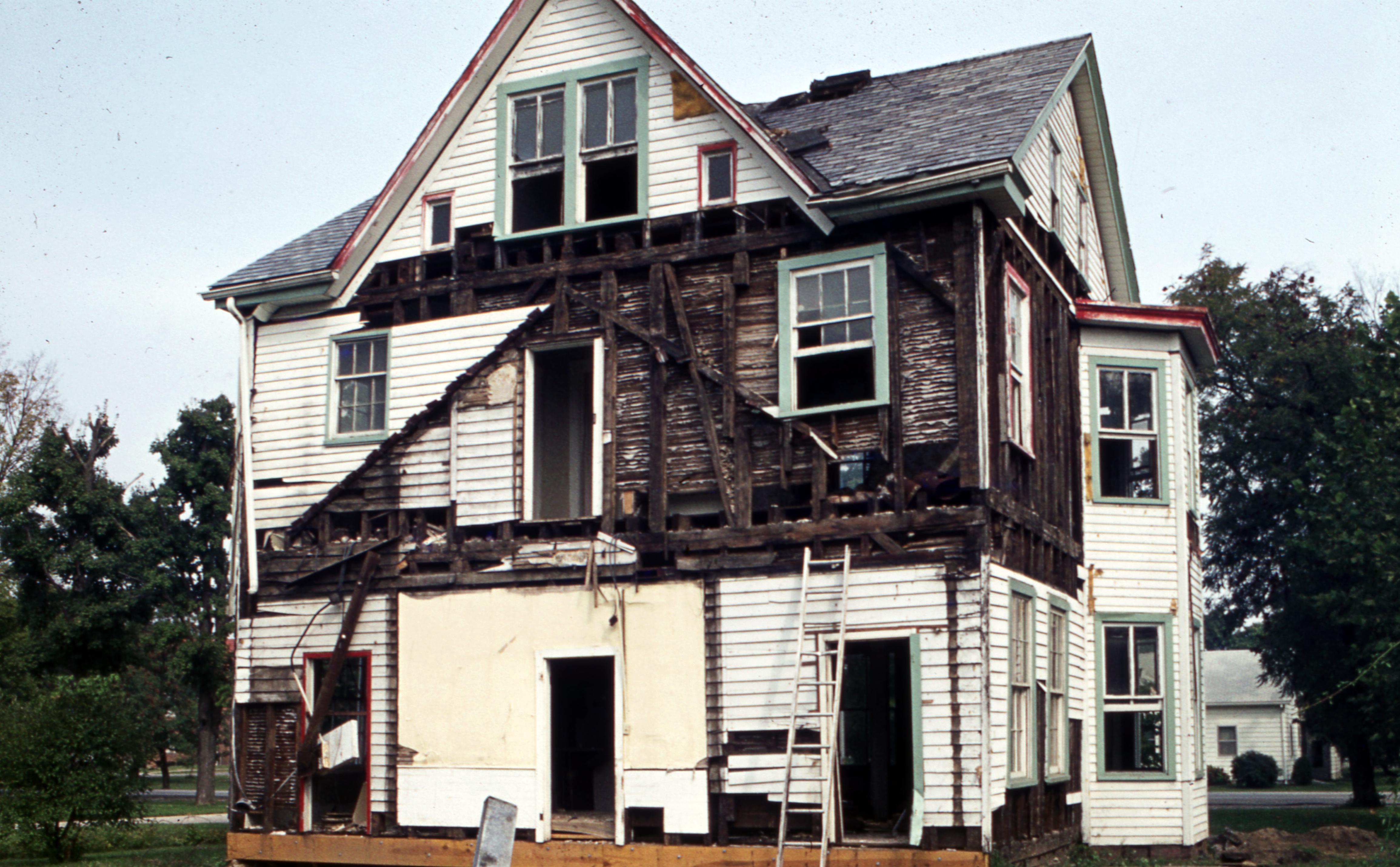 Golden House: This building was moved from the plat of 807 Church, what is now 811 Church Street, to one plat west of 723 E. Church Street but has since been demolished, most likely when the house at 707 E. Church was built in 2009. Elmer Buchta Moving Engineers was contracted for this and many other building moves during the 1970s. This photo shows the back of the house, the south side, once the rear addition had been removed. The photo was taken before the move to the new location.