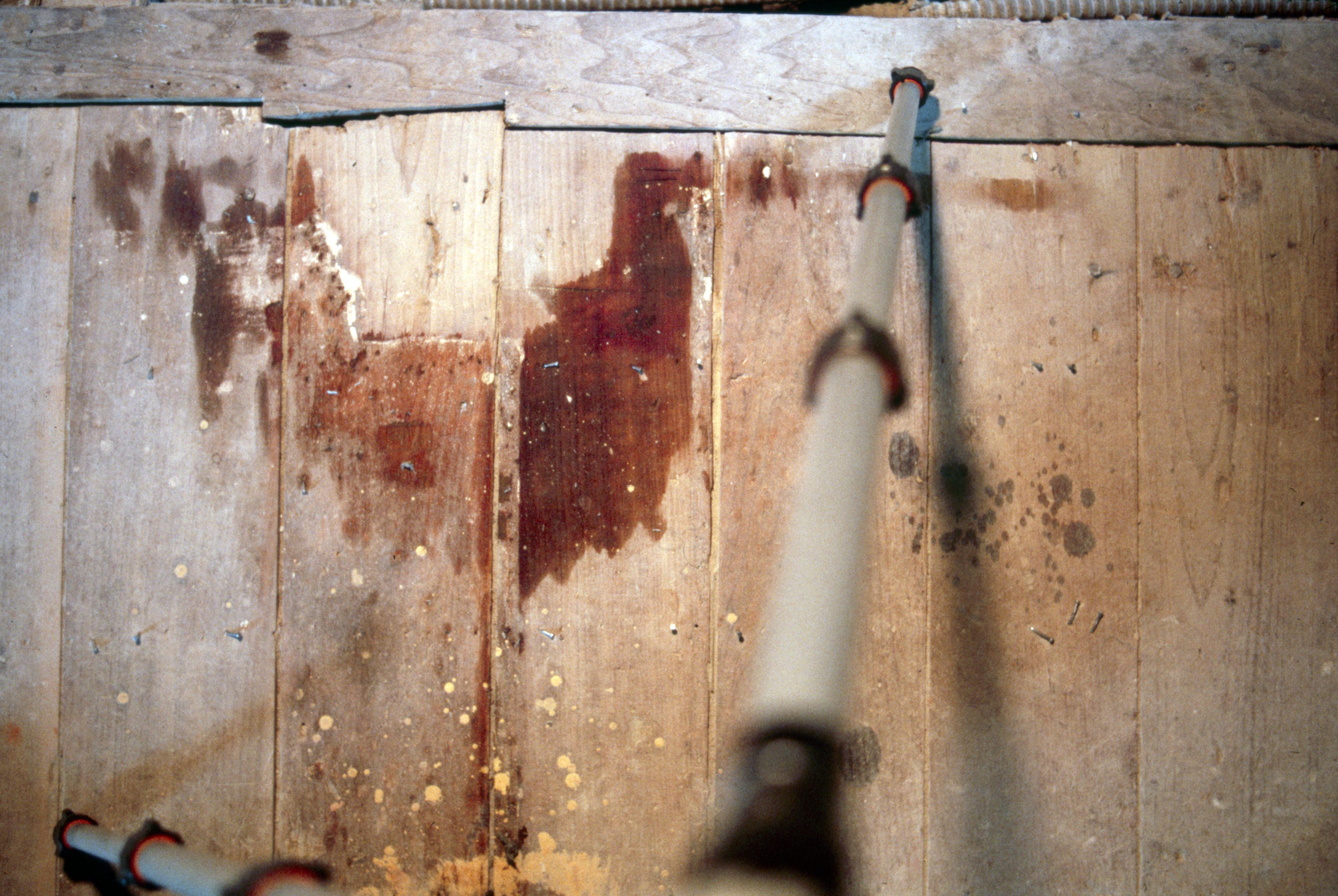 Schnee House: This photo is of the second Schnee home located at 603 West Street and was constructed in 1876. The first Schnee home was constructed during the Rappite occupation of the town, the Schnee brothers having moved to the town from the Quaker colony in Pennsylvania, and that house was located at 517 Tavern Street. The Gypsy Girl Livery Stable was later constructed behind that home. This appears to be a stain on the original plank floor of the house, possibly made from an oil of some kind.