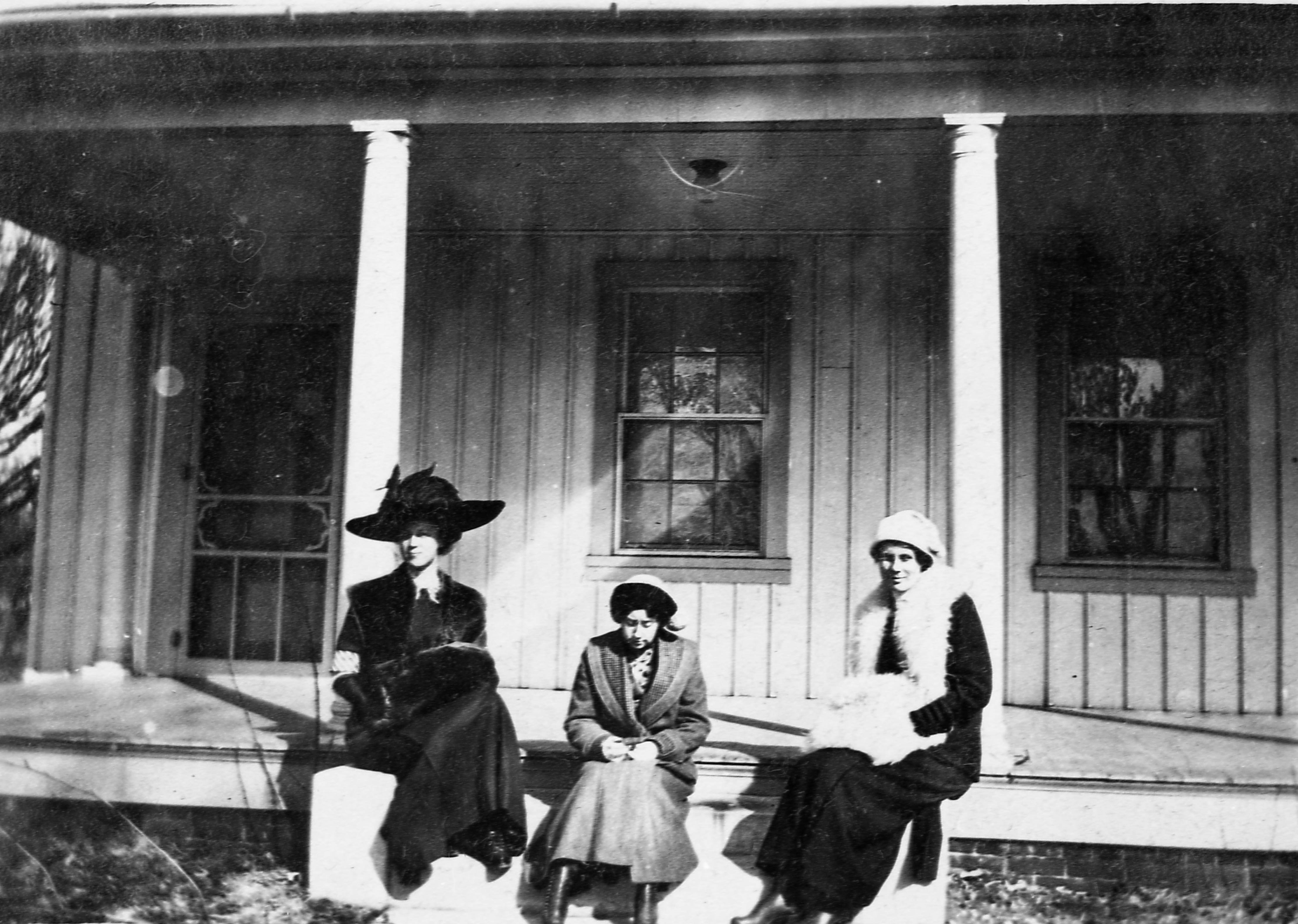 Transparencies and Negatives Collection: Historic photographs. This photo shows three unidentified women sitting on the steps of the Wheatcroft House.