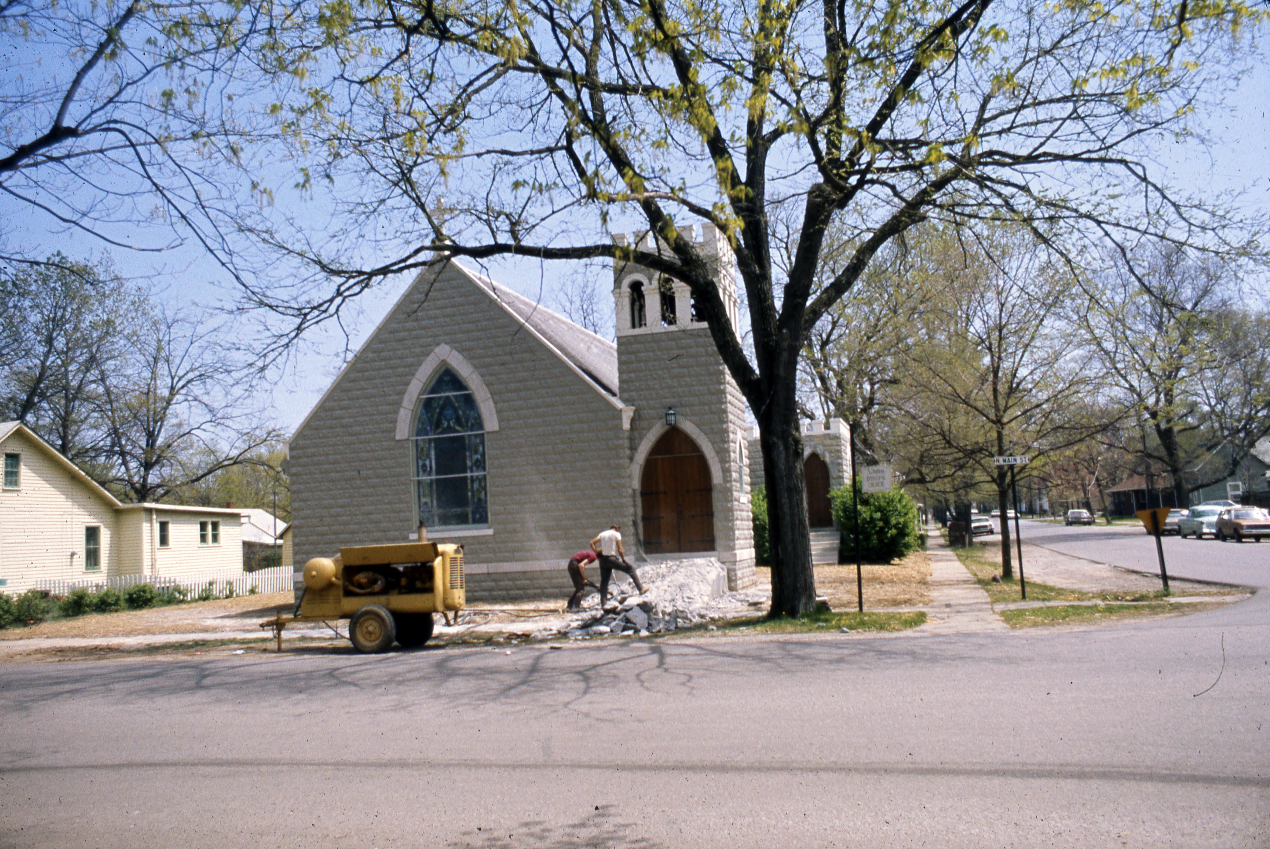 St. Stephen's Episcopal Church: The church was first organized in 1841 and in 1843 the west wing of the old Rappite church was given for use by the Episcopal�s by Alexander and Anne Maclure. At this time the old burial ground was also given to the church, which was bought back by the Rappites in 1846. Then in 1850 the Episcopal�s sold the west wing of the old Rappite Church for $1000 and in 1854 St. Stephen�s Church was constructed, the North Street location where the Lenz House now resides.1888 saw the construction of a new belfry add to the church to accommodate the new bell. In 1911 the new church was built, and an addition was made to it in 1927. The church is still present as of 2022. This is a photo of the church steps being reconstructed during renovations.