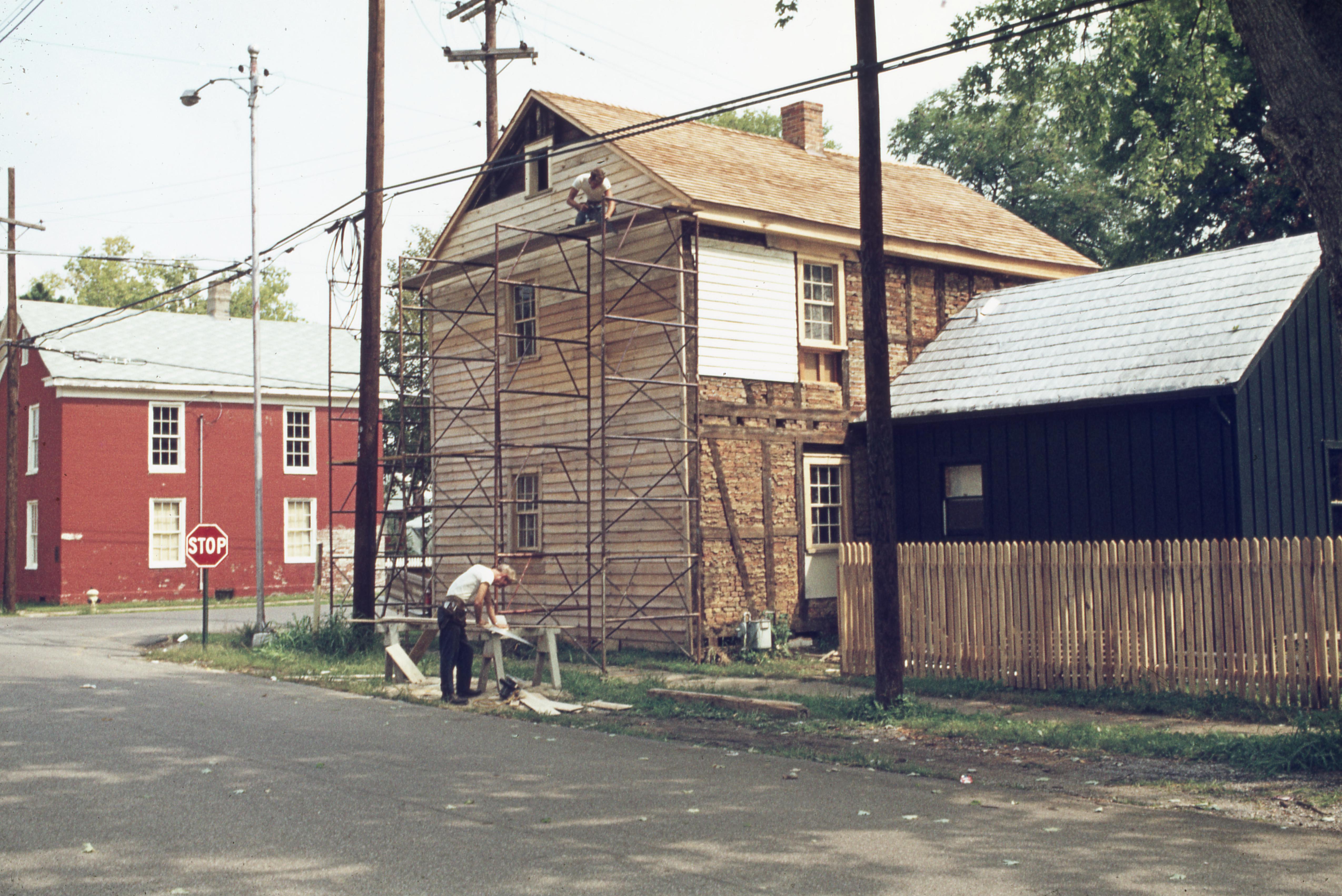 Autrieth House: This house is located at 605 Tavern Street and was constructed in 1855. This is the west side of the house with the new clapboards being hung. The original third level small arched window has been replaced with a new squared casing one. The original brick filled timber frame on the south side of the house is still exposed. The on the left side of the back house was eventually left exposed under glass to show the original brick and timber frame construction of 1855.
