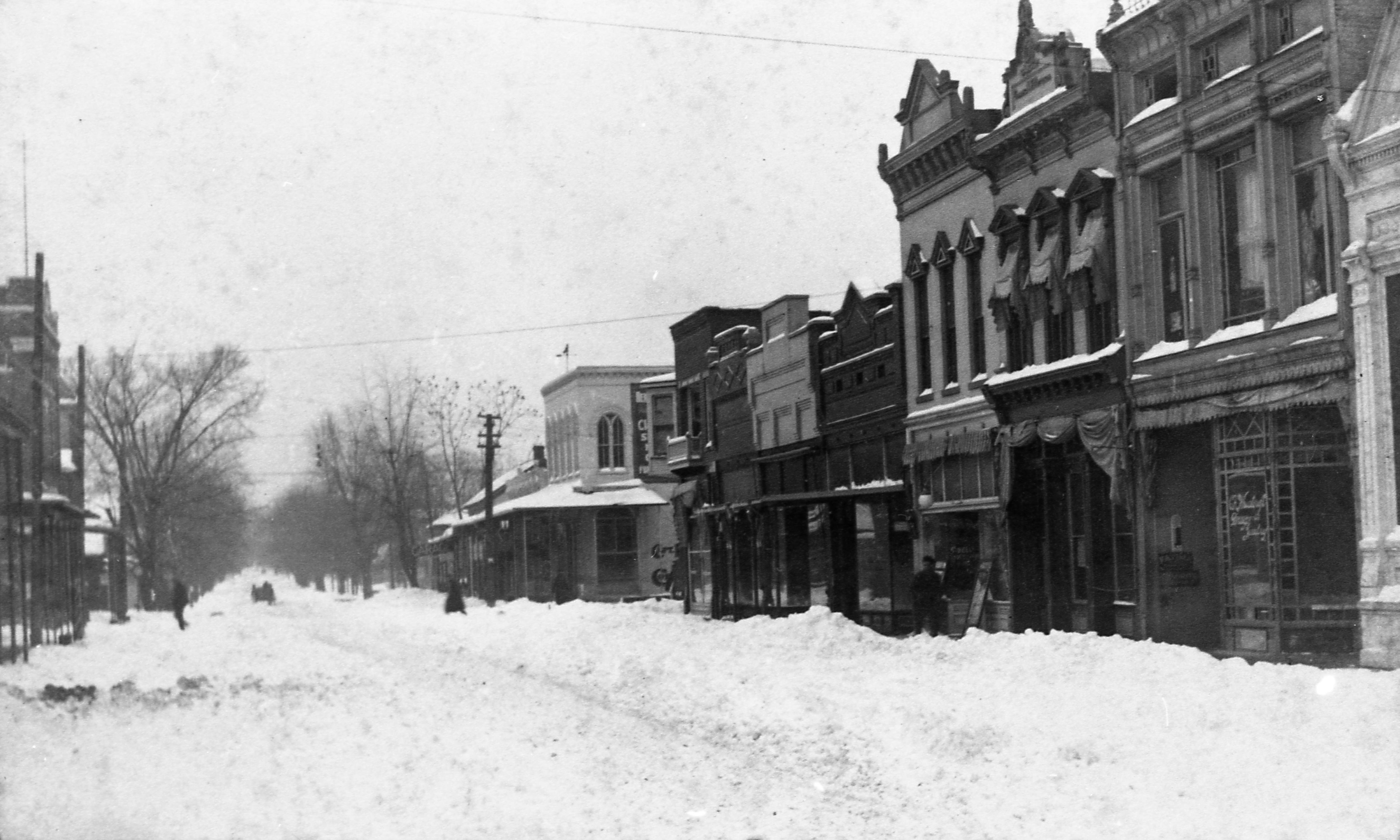 Transparencies and Negatives Collection: Historic photographs. This is a photo of Main Street, facing toward the south, between Church and Tavern Streets. It shows the Main Street business district after a heavy snowfall, which had to be after the August 1908 Monitor Corner Fire.