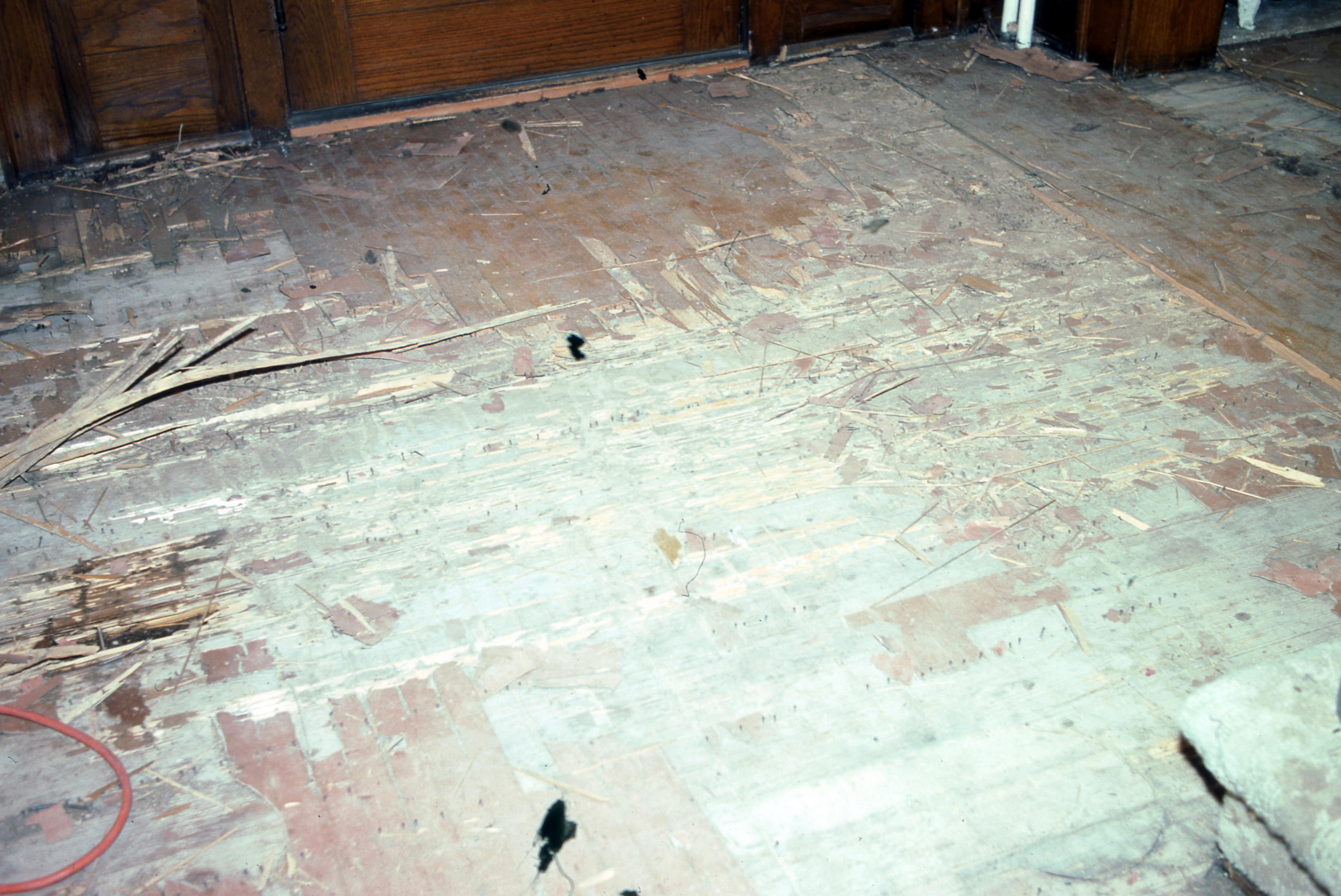 Schnee House: This photo is of the second Schnee home located at 603 West Street and was constructed in 1876. The first Schnee home was constructed during the Rappite occupation of the town, the Schnee brothers having moved to the town from the Quaker colony in Pennsylvania, and that house was located at 517 Tavern Street. The Gypsy Girl Livery Stable was later constructed behind that home. Later period hardwood flooring is being removed in this photo. The original plank floor can be seen underneath it.