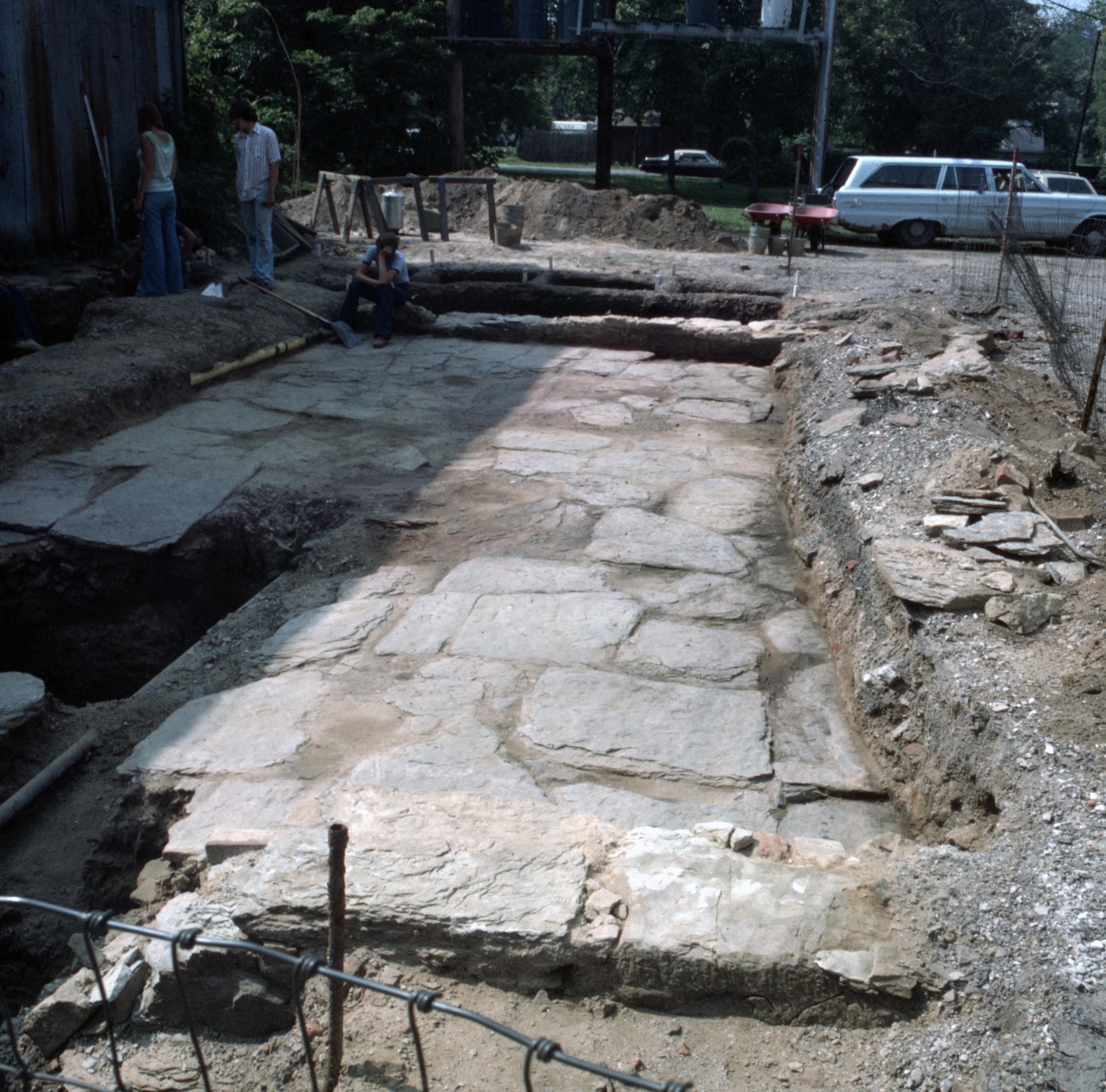 Stone Warehouse: The Stone Warehouse was located behind the 602 Main Street building, which is now under a parking plat. This photo shows the archaeological excavation of the Stone Warehouse floor facing toward the south. The metal building on the left of the photo is the site of the old Gypsy Girl Livery stable. This building is no longer present in July 2021.