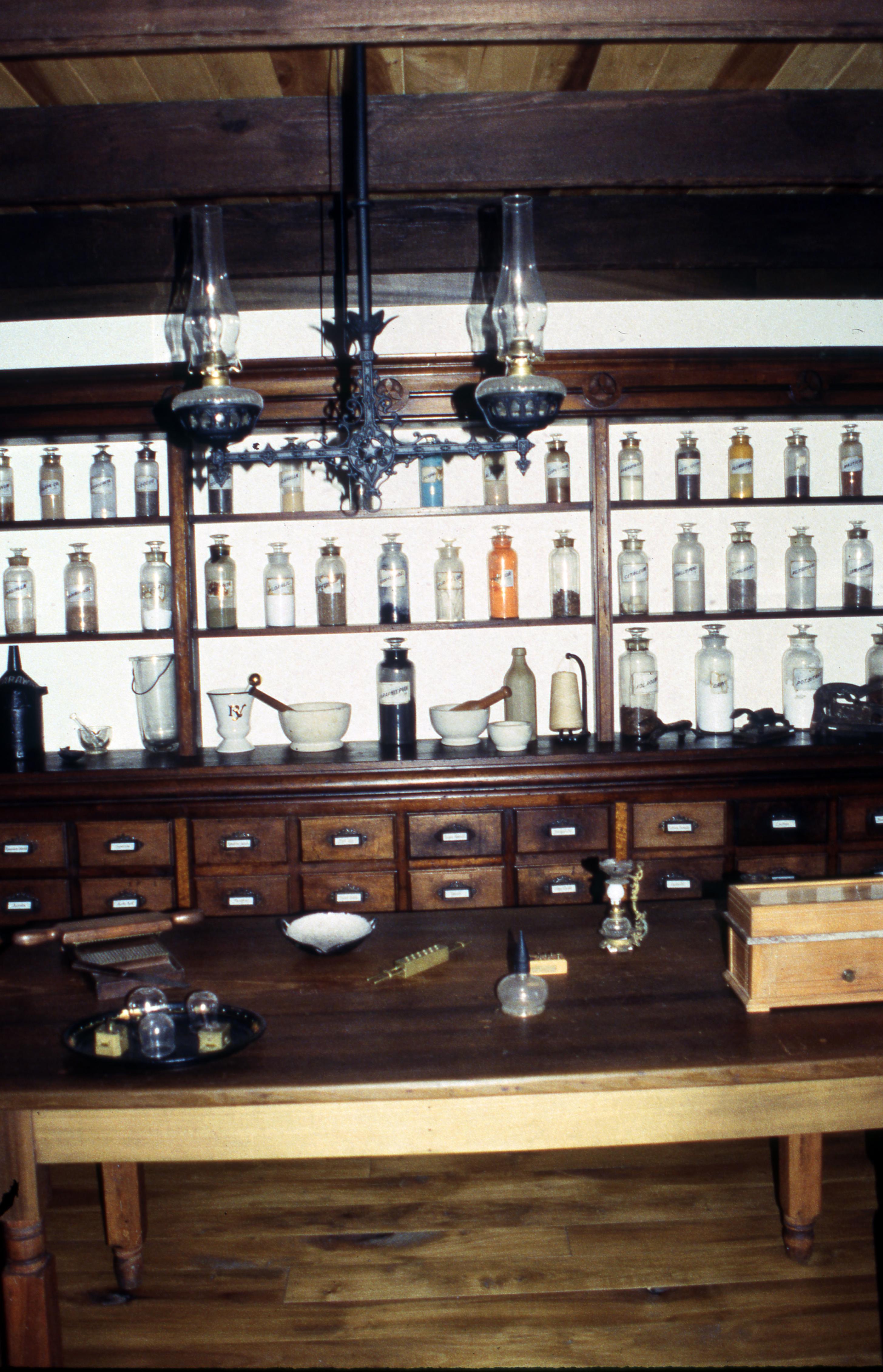 Kemmerling House/1850s Doctor's Office: The Kemmerling House was relocated from town Block 4 J/SE to the new location at 611 Church Street, beside the Beal House. The Kemmerling House was remodeled into the 1850s Doctor's Office, a gift to the town of New Harmony from Mead Johnson. The Kemmerlings were listed in the 1882 Posey County Directory (as Kimmerlin) as being New Harmony Township farmers. Elmer Buchta Moving Engineers was contracted for this and many other building moves during the 1970s. This photo shows the pharmacy counter in the 1850s Doctor's Office. Note the shelves full of nineteenth century pharmaceutical chemicals and the row of mortar and pestles on the bottom shelf.