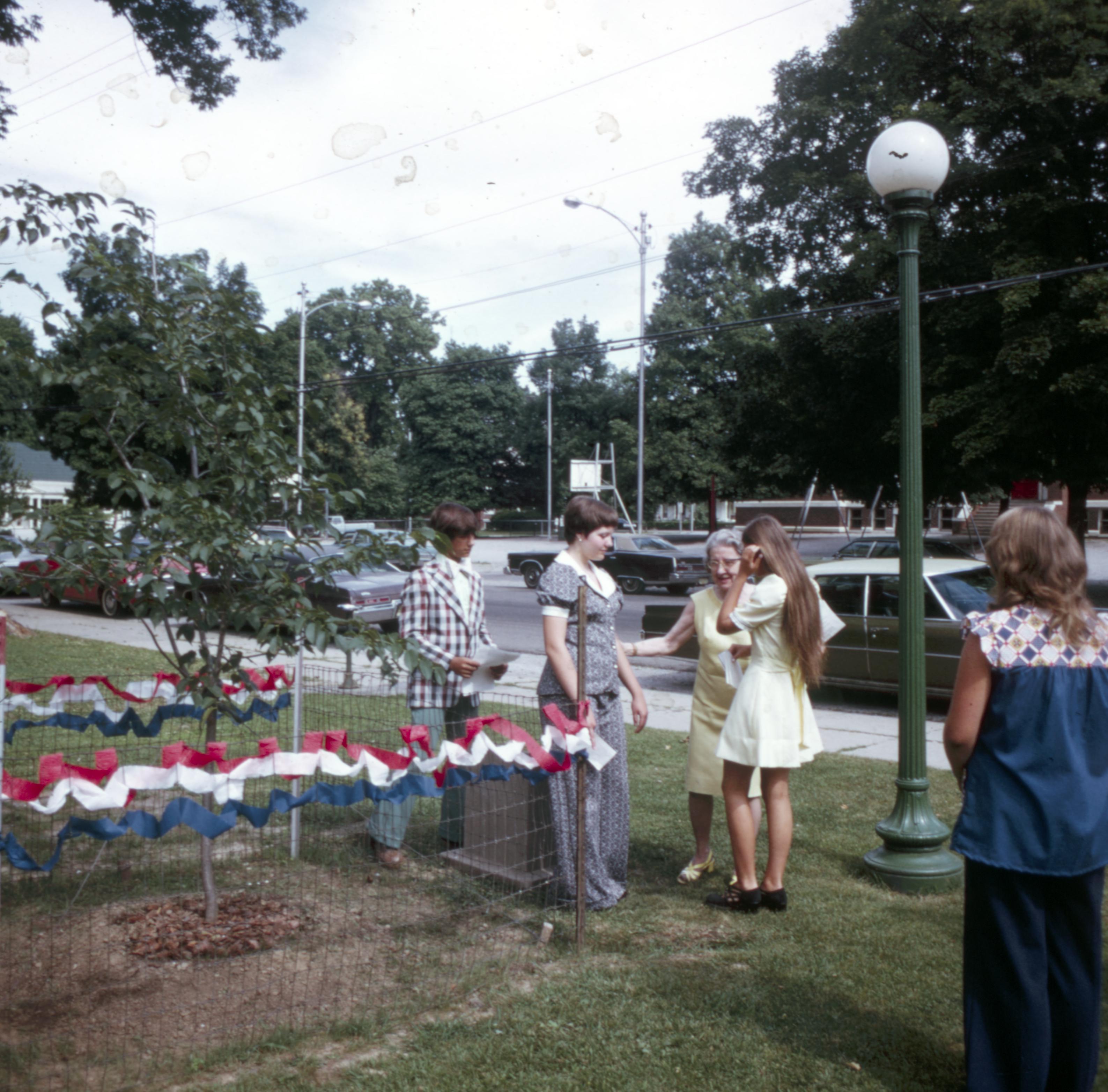 Guild Of Guides: The New Harmony chapter of the Indiana Junior Historical Society was called The Guild of Guides. The IJHS was formed in 1938 and this society had chapters, across the state of Indiana, which were formed by junior high and high school students who had an interest in historical things. The Guild of Guides produced a paper and photographs, in 1968, titled Architecture In New Harmony, Indiana, 1814 - 1969 which was published in a periodical produced by the IJHS. In this photo the group is standing, for the dedication of a tree, in front of the stone marker set at the front of Murphy Auditorium. This tree is still present in 2021 and is somewhat dislodging the stone marker.