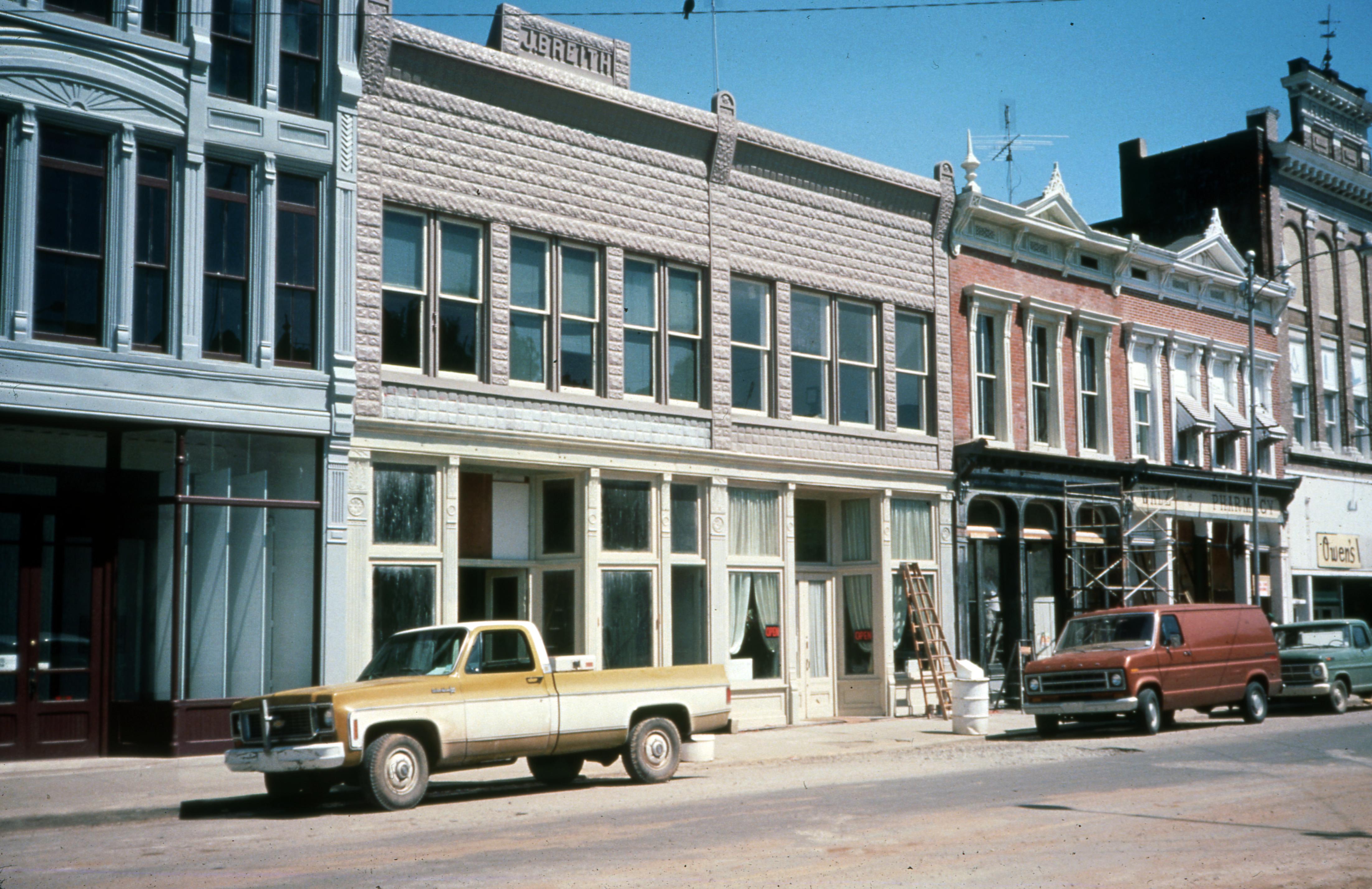 Streets: This is a photo of the businesses along the east side of Main Street between Church and Tavern. From left to right: The New Harmony Gallery of Contemporary Art, The New Harmony Gallery of Contemporary Art sales floor, The Lemon Tree ice cream parlor, the Centennial Saloon, Walz Pharmacy, and the Ribeyre Building.