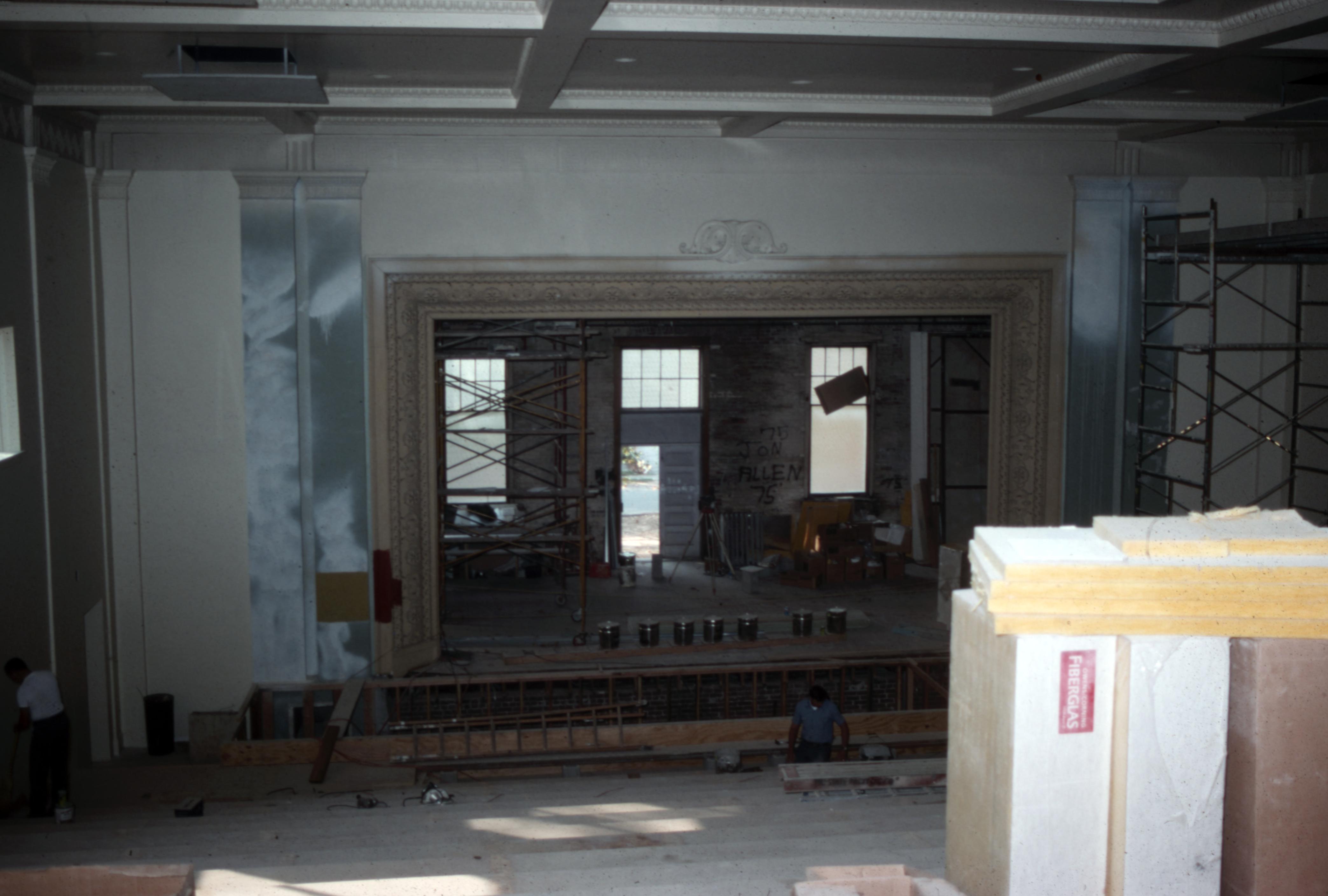 Murphy Auditorium: Murphy Auditorium is located at 419 Tavern Street and was constructed on the plat just east of the Working Men's Institute from 1911 to 1913, using the Doctor Edward Murphy Fund, and was built as part of New Harmony's centennial celebration of 1914. In 2014, the town's bicentennial, Murphy Auditorium became the new home of the concert series Under The Beams, originally housed in the Rapp-Owen Granary. Today, the auditorium is owned by the University of Southern Indiana and is the home of The New Harmony Theater with a seating capacity of 360 people. This is a photo of the work which was carried out in the stage area of the building.