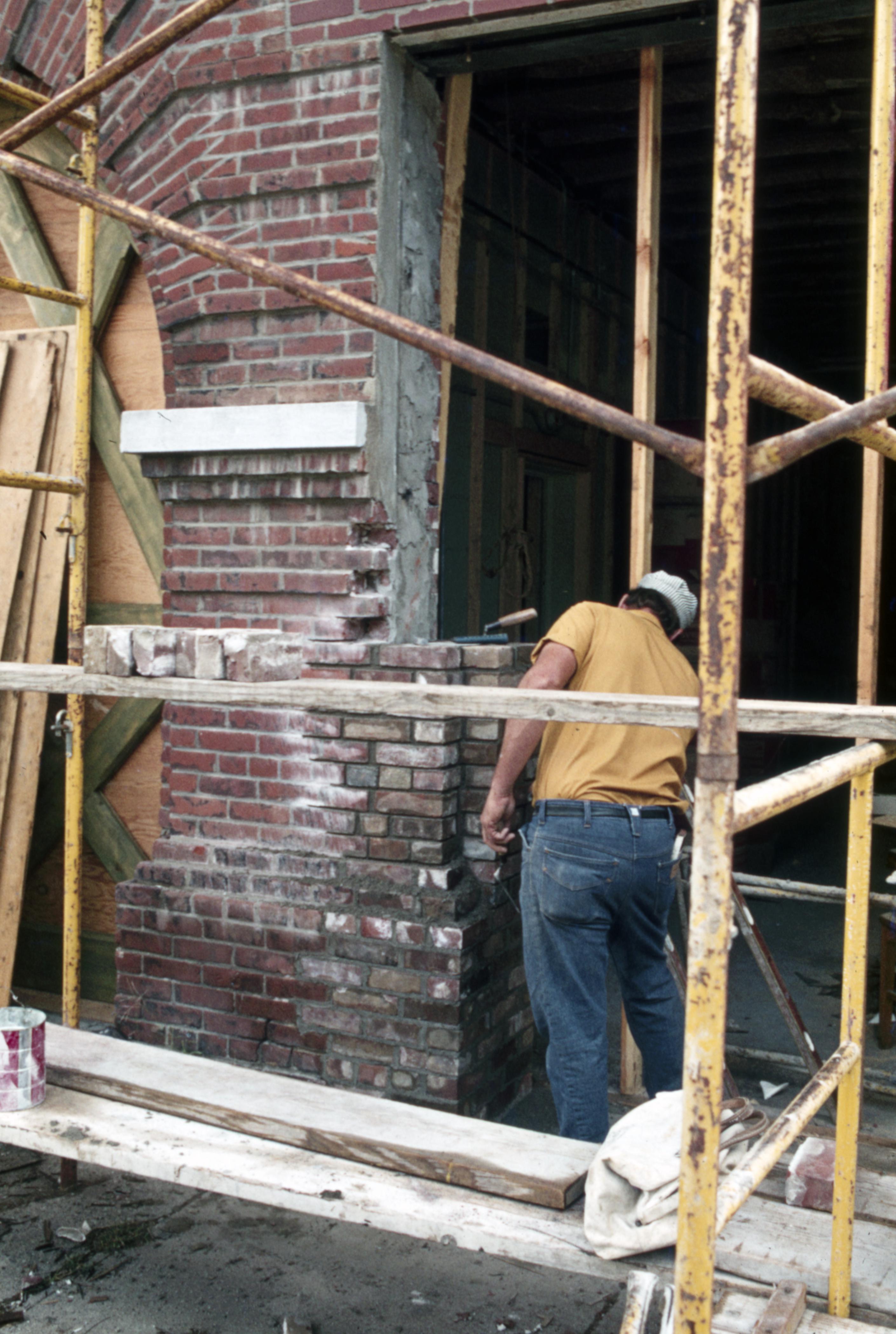 The City Building: This building is Located at 608 Main Street and housed the firehouse on the ground floor and City Hall on the second floor. A worker is bricking up the right side of the building to return it to the original appearance.