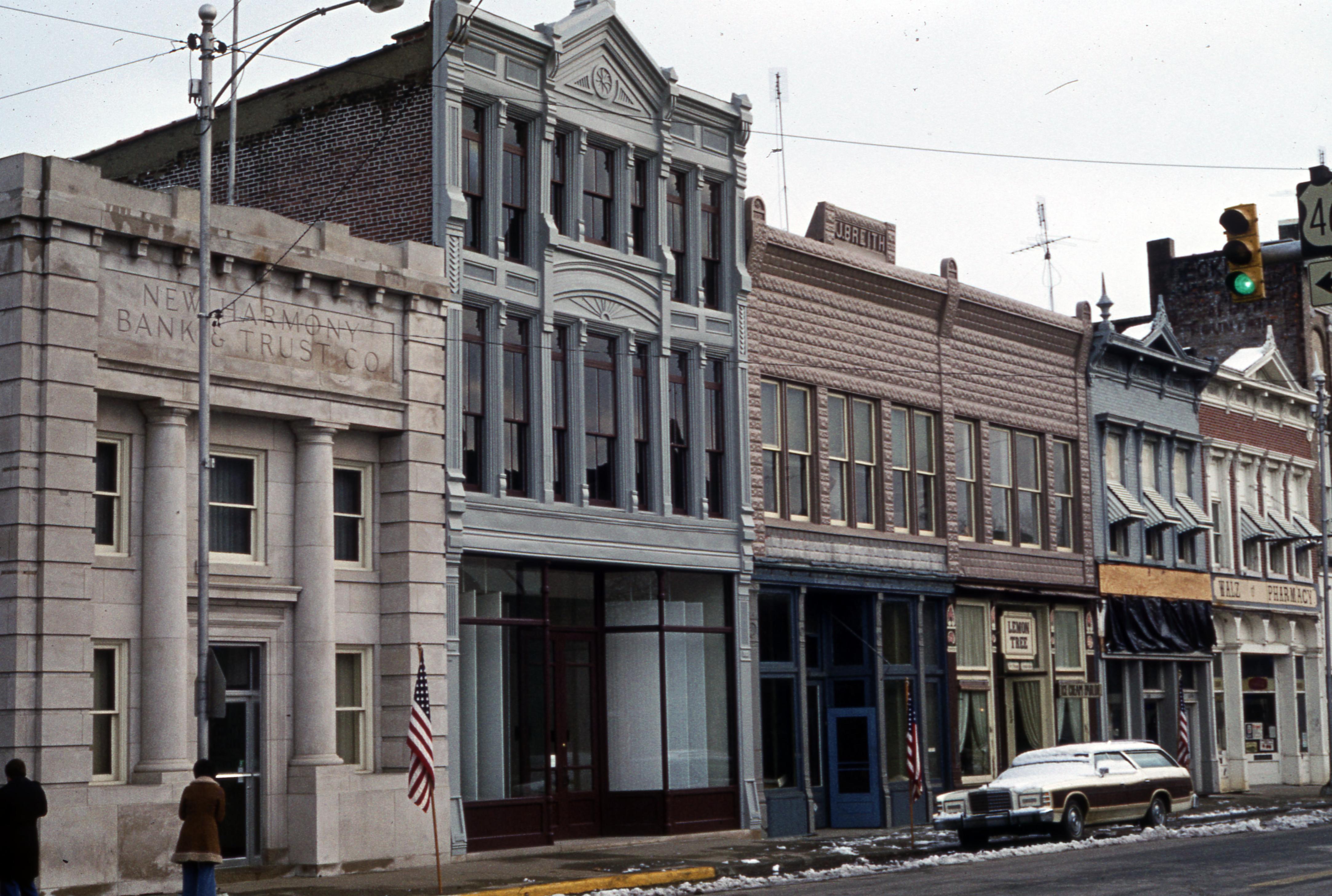 Streets: This is a photo of the businesses along the east side of Main Street between Church and Tavern. From left to right: New Harmony Bank & Trust, The New Harmony Gallery of Contemporary Art, The New Harmony Gallery of Contemporary Art sales floor, The Lemon Tree ice cream parlor, the Centennial Saloon, Walz Pharmacy, and the Ribeyre Building.