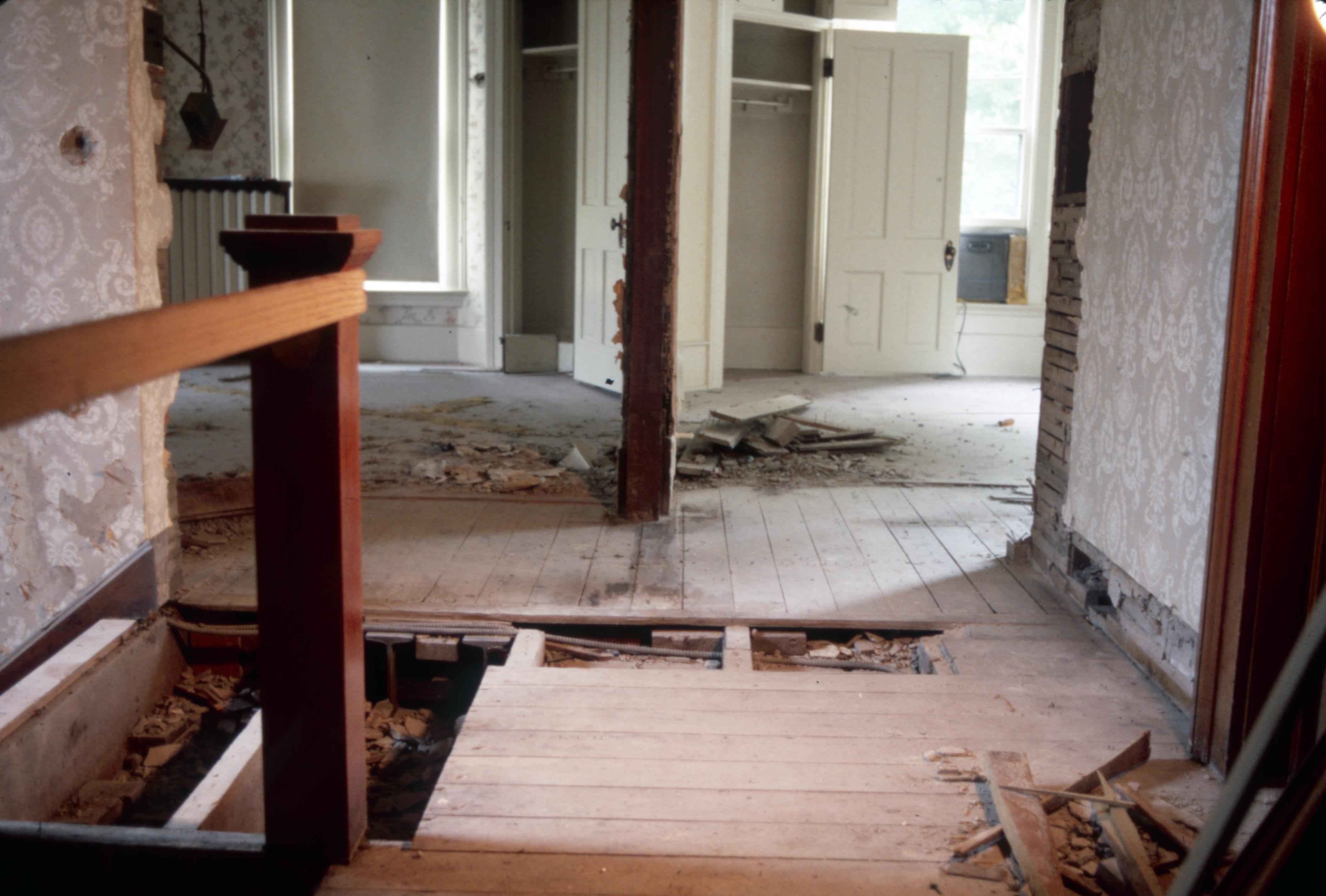 Schnee House: This photo is of the second Schnee home located at 603 West Street and was constructed in 1876. The first Schnee home was constructed during the Rappite occupation of the town, the Schnee brothers having moved to the town from the Quaker colony in Pennsylvania, and that house was located at 517 Tavern Street. The Gypsy Girl Livery Stable was later constructed behind that home. This photo shows the restoration work occurring on the second floor of the house.