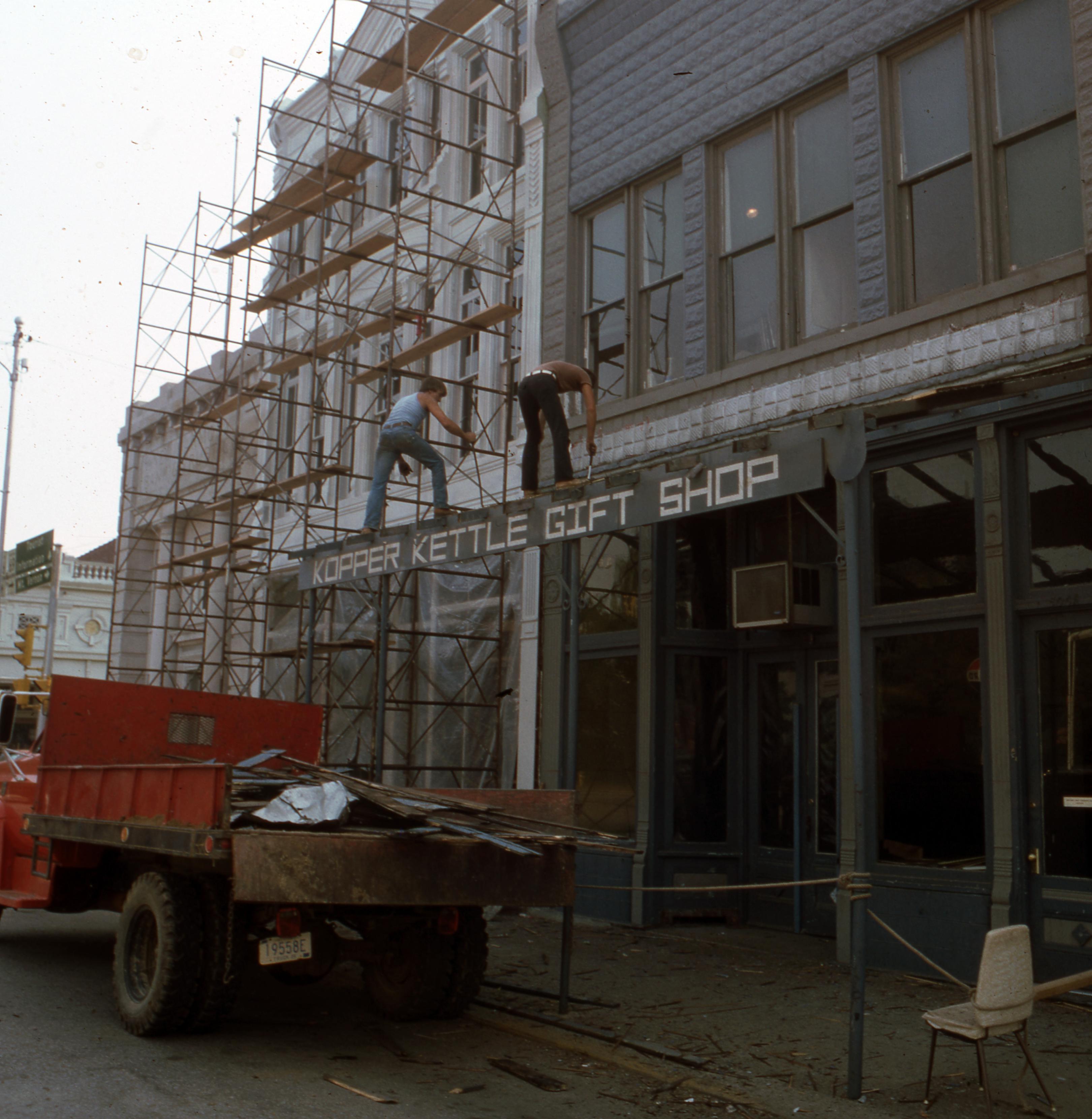 New Harmony Gallery of Contemporary Art: Located at 504 Main Street initially and now both 504 and 506 Main Street with 506 being used as a sales floor. The art gallery, opened in the fall of 1975, after the building went through refurbishment and is still a part of the University of Southern Indiana today (2021). The gallery is a not-for-profit space for artists to hold exhibitions of their work with a sales floor in the adjoining building at 506 Main. Daniels Painting Company was contracted for painting the interior of the building in October 1975. This is a photo of the renovations to the front face of the building. On the building to the south, on the right side, two construction workers are beginning to work on the roof to the porch on the Kopper Kettle Gift Shop.