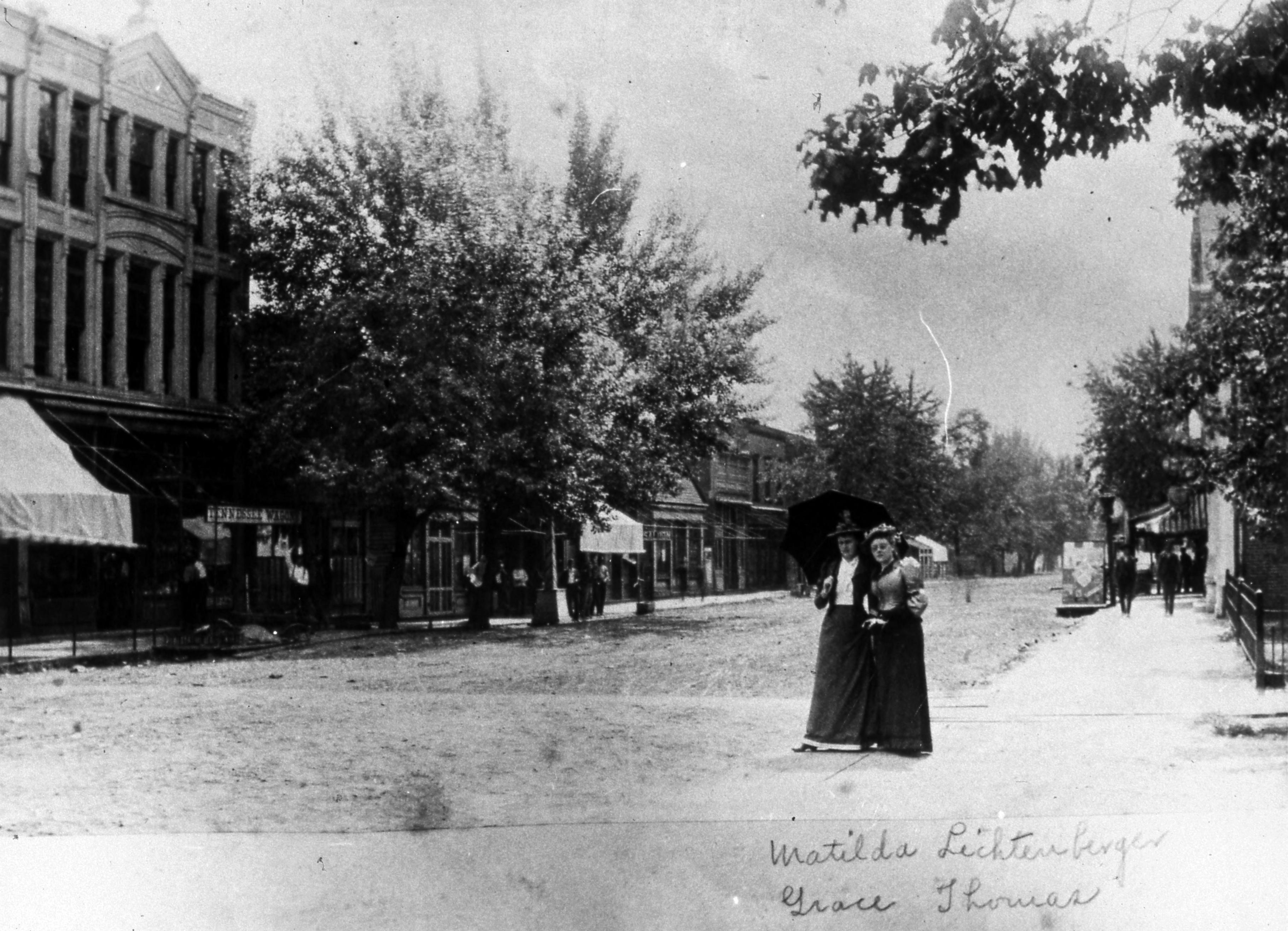 Streets: This is a historic photo of Main Street, facing south, between Church and Tavern. The girls in the photo are marked as Matilda Lichtenberger, on the right, and Grace Thomas on the left. The photo must have been taken before 1899 because the J Breith and Heckman Buildings have not yet been constructed.