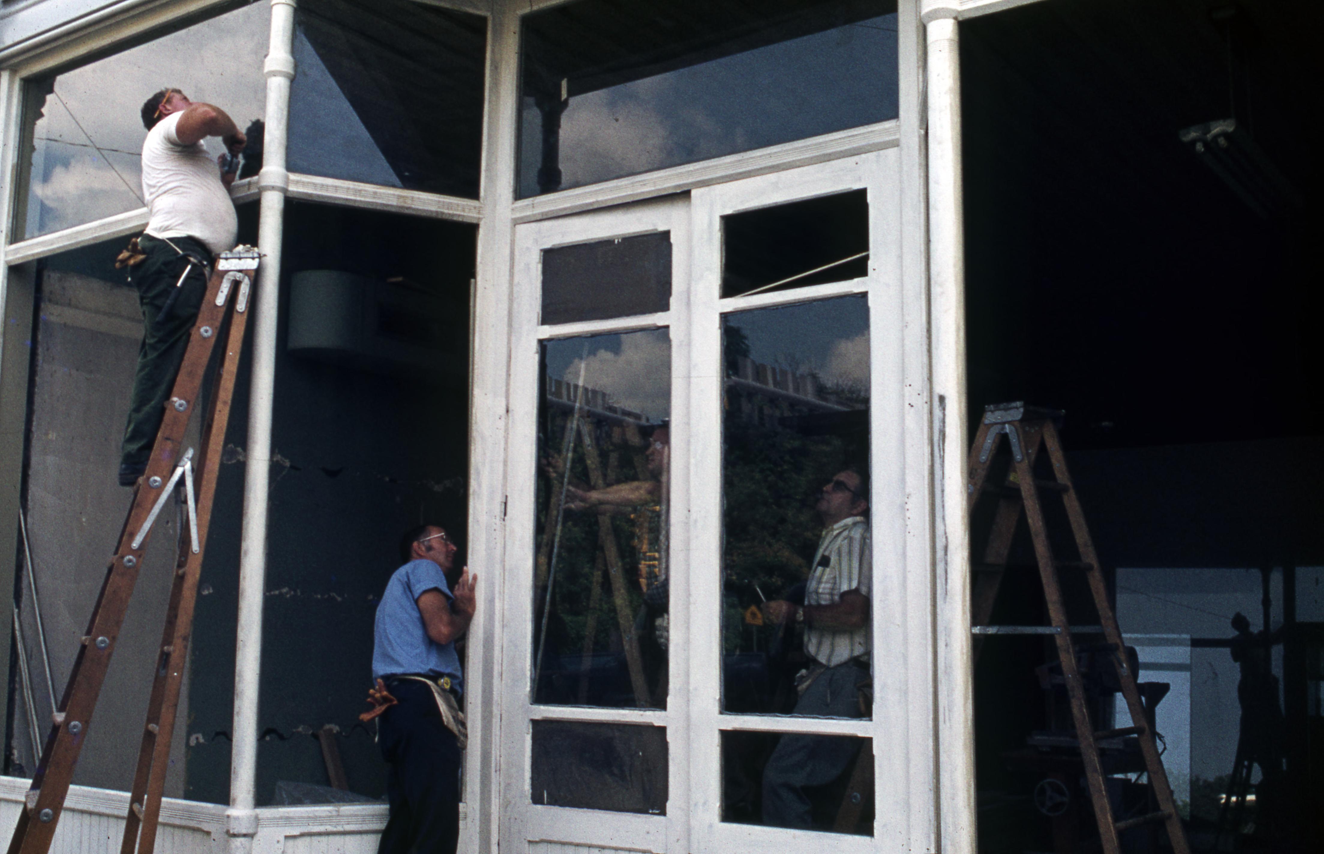 The Owen Building: This building is located at 504 Main Street and was once the right side of 502 Main Street. The two buildings combined have a long history, being built before 1888. They were the location of E. F. Owen and Company�s store, this side being the hardware shop at least until 1907 or later. New Harmony Gallery of Contemporary Art now located in both 504 and 506 Main Street with 506 being used as a sales floor. The art gallery, opened in the fall of 1975, after the building went through refurbishment and is still a part of the University of Southern Indiana today (2021). The gallery is a not-for-profit space for artists to hold exhibitions of their work with a sales floor in the adjoining building at 506 Main. In this photo construction workers are setting new glass into the windows at the front of the building.