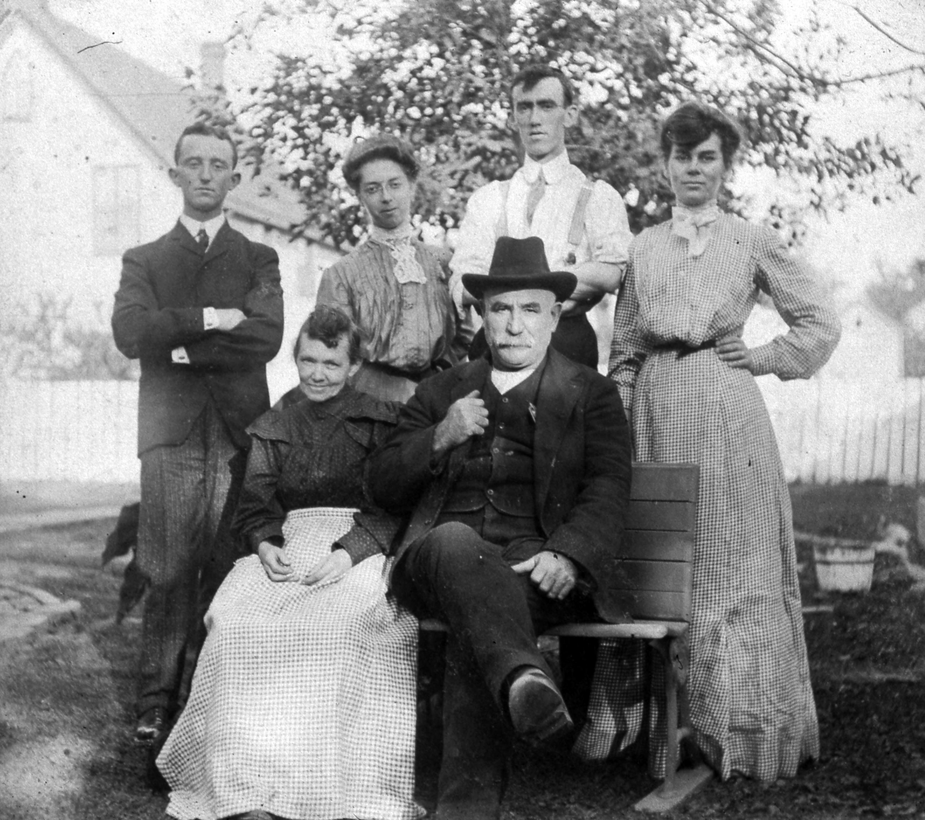 Chaffin House: This house is located on the northwest corner of Church and First Streets. During the mid and late nineteenth century the property belonged to Thomas Ferguson and there was a house on this plat before the Chaffin House, still present in 2022 albeit somewhat remodeled, was constructed in 1905. Before this time Lycurgus Chaffin owned property on Main Street near the corner with Steam Mill, that house was demolished at some point between March 1913, it can be seen in several flood photos, and the 1929 Sanborn Fire Insurance Maps. This is a photo of the Chaffin family posed in the back yard of their home on Church Street. In this photo are standing left to right: Edward Chaffin Ford (3/5/1880 � 11/14/1956), his wife Pansy Storton Ford (1/5/1884 � 10/12/1942), Charles Lycurgus Chaffin (1/6/1881 � 11/30/1955), and his wife Clara Emma Baechle Chaffin (4/25/1879 � 9/8/1933). Seated left to right: Edith Applegate Chaffin (9/4/1849 � 1/30/1909), and husband John Horatio Chaffin (12/21/1847 � 5/16/1921).