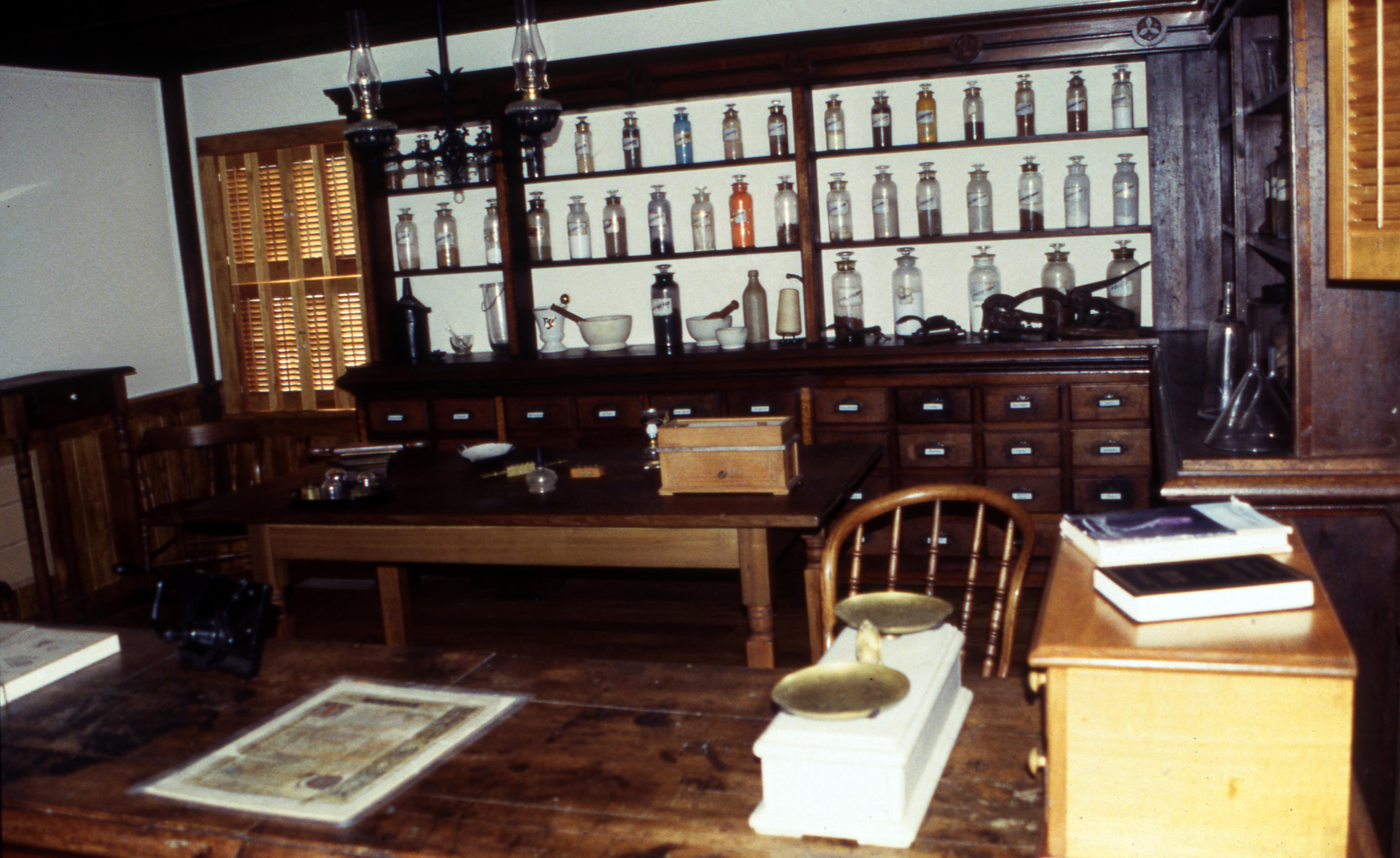 Kemmerling House/1850s Doctor's Office: The Kemmerling House was relocated from town Block 4 J/SE to the new location at 611 Church Street, beside the Beal House. The Kemmerling House was remodeled into the 1850s Doctor's Office, a gift to the town of New Harmony from Mead Johnson. The Kemmerlings were listed in the 1882 Posey County Directory (as Kimmerlin) as being New Harmony Township farmers. Elmer Buchta Moving Engineers was contracted for this and many other building moves during the 1970s. This photo shows the pharmacy counter in the 1850s Doctor's Office. Note the shelves full of nineteenth century pharmaceutical chemicals and the row of mortar and pestles on the bottom shelf and the medicine scale on the counter in the foreground.