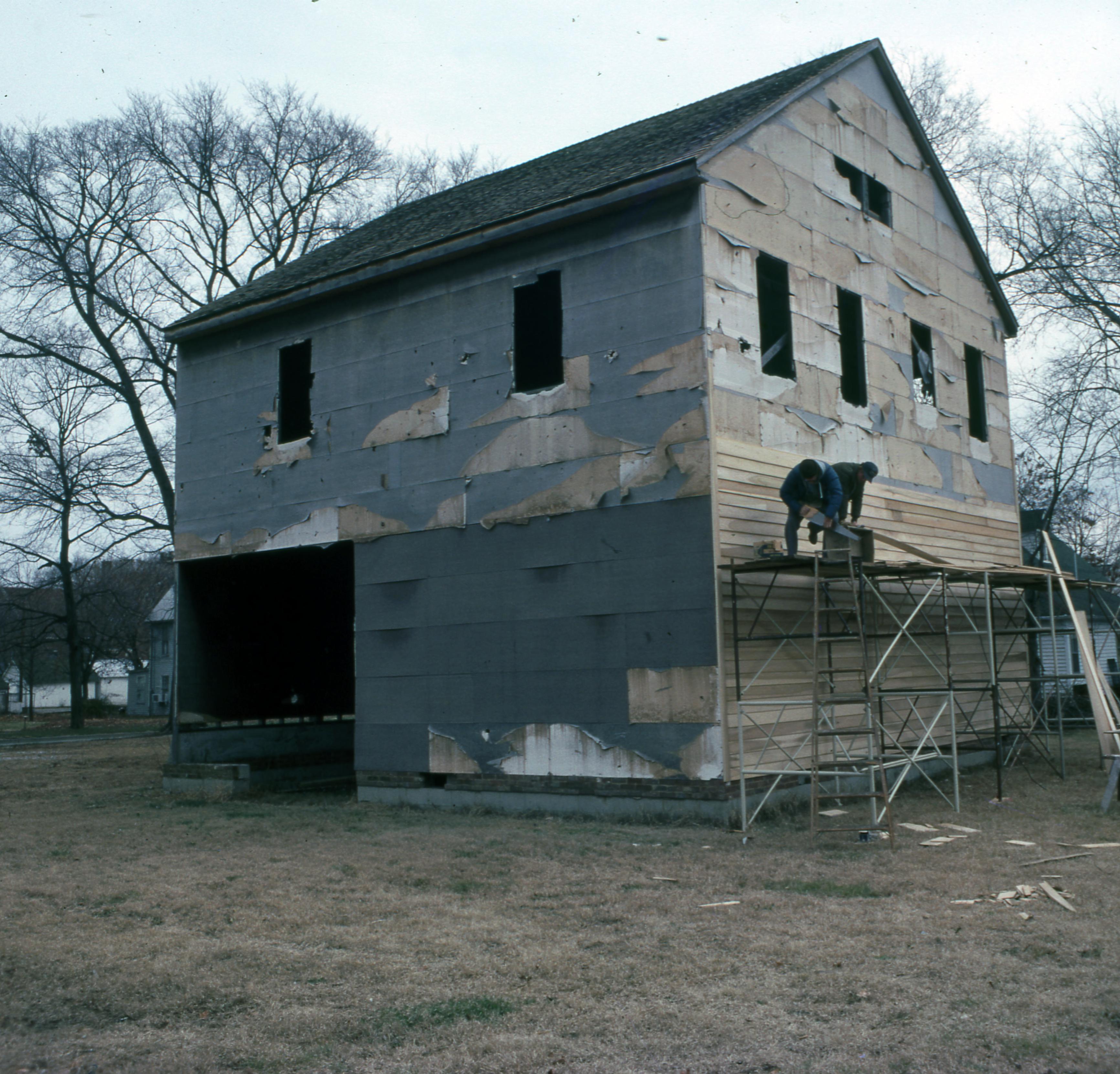 Golden House: This building was moved from the plat of 807 Church, what is now 811 Church Street, to one plat west of 723 E. Church Street but has since been demolished, most likely when the house at 707 E. Church was built in 2009. Elmer Buchta Moving Engineers was contracted for this and many other building moves during the 1970s. This photo shows the southeast corner of the house during the remodel.