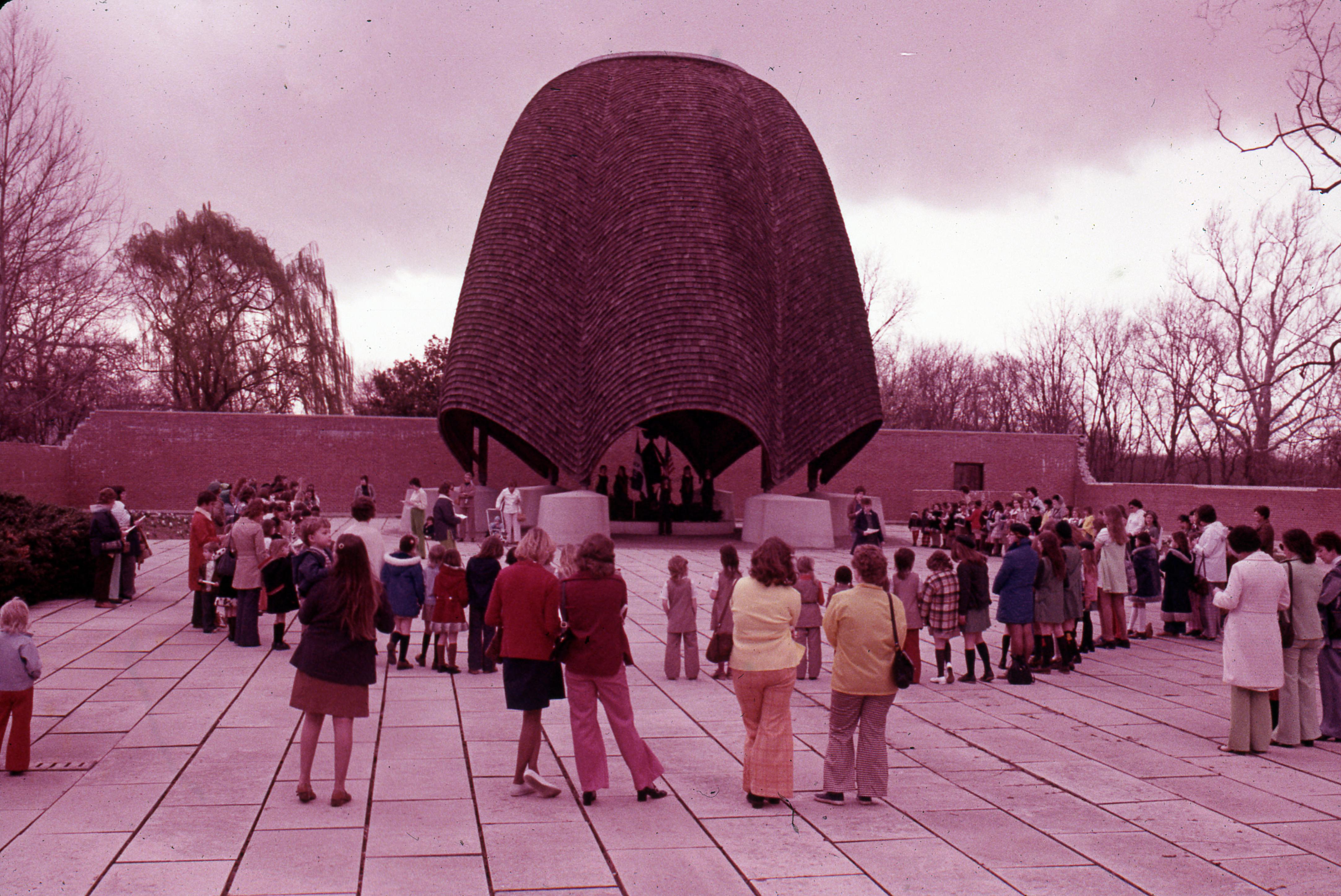 Group of children at ceremony in Roofless Church. The Roofless Church is located at 420 and was commissioned by the late Jane Blaffer Owen and built by architect Philip Johnson. The inter-faith church was dedicated in 1960 and is open to the public.