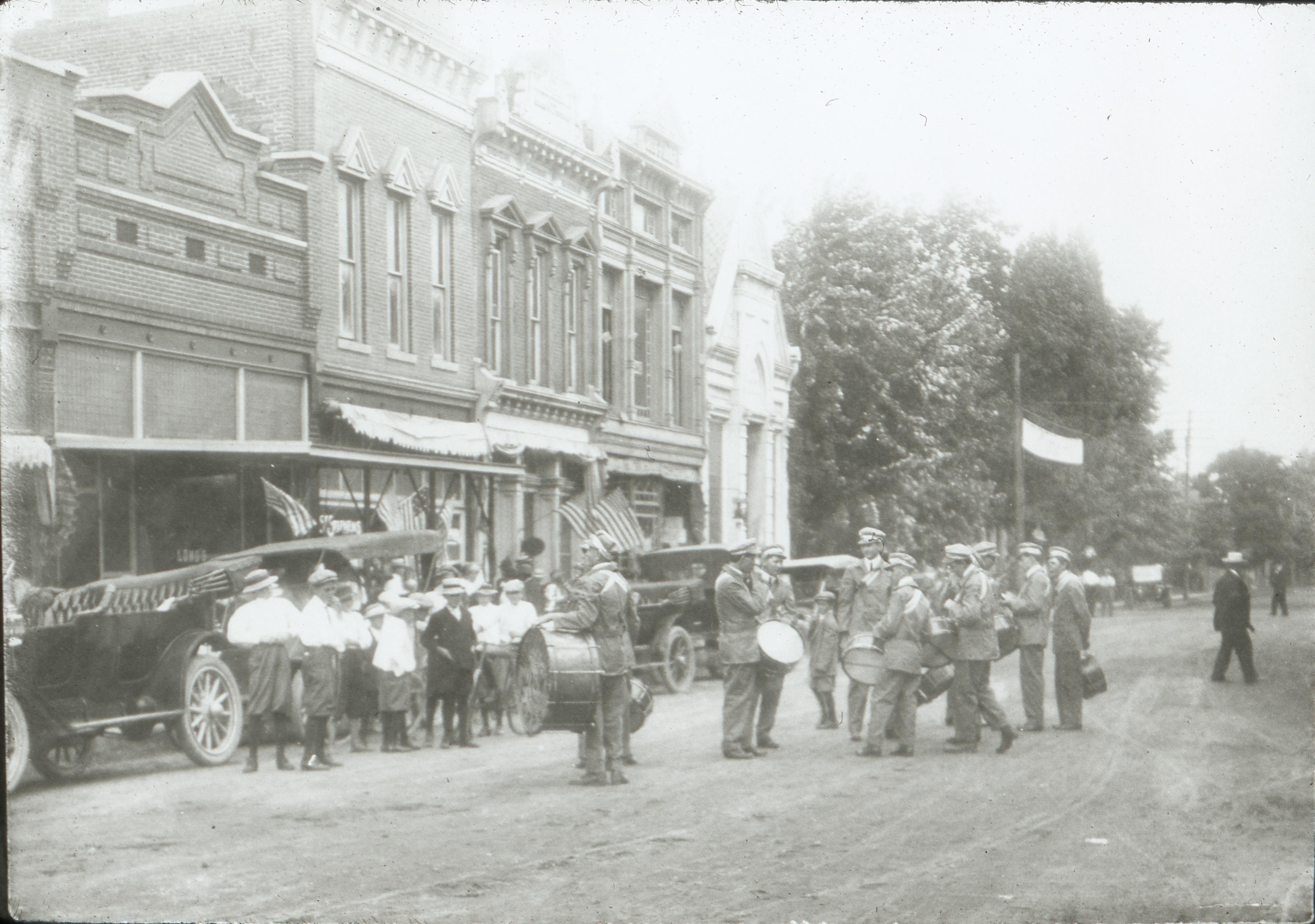 Historic Photo. Streets Collection: Main Street, facing toward the north, near the corner with Church Street. Note that this photo shows a marching band standing in the street, probably the New Harmony Band or possibly the Golden Band.