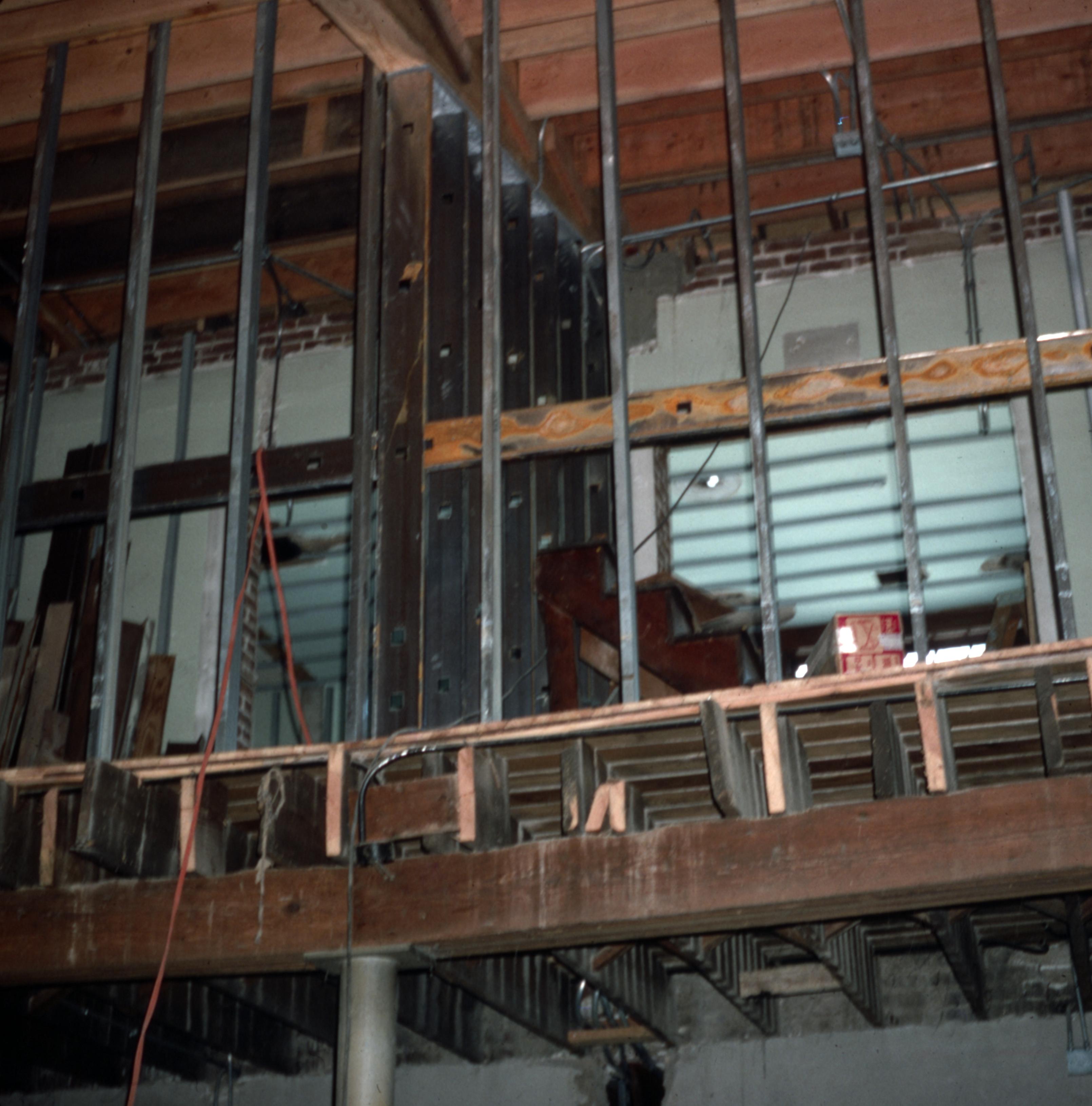 Murphy Auditorium: Murphy Auditorium is located at 419 Tavern Street and was constructed on the plat just east of the Working Men's Institute from 1911 to 1913, using the Doctor Edward Murphy Fund, and was built as part of New Harmony's centennial celebration of 1914. In 2014, the town's bicentennial, Murphy Auditorium became the new home of the concert series Under The Beams, originally housed in the Rapp-Owen Granary. Today, the auditorium is owned by the University of Southern Indiana and is the home of The New Harmony Theater with a seating capacity of 360 people. This photo is a view of the refurbish work occurring inside the auditorium.