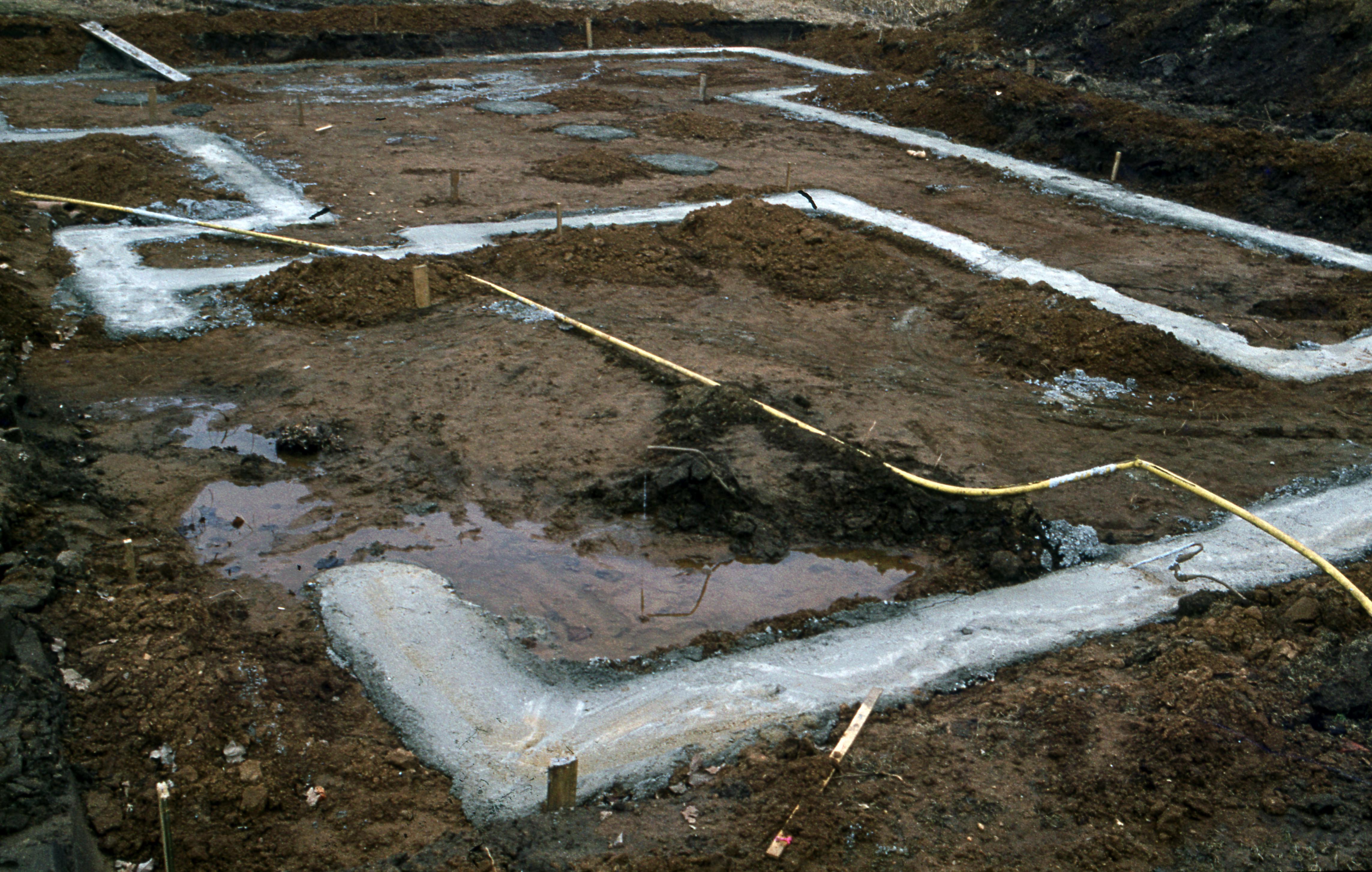 Bauer House: This house was originally located on the north side of North Street in town block 2 C/E. It was moved to the new location at 518 First Street before construction on the Atheneum had begun. Elmer Buchta Moving Engineers was contracted for this and many other building moves during the 1970s. This is a photo of the new foundation at plat 518 First Street.