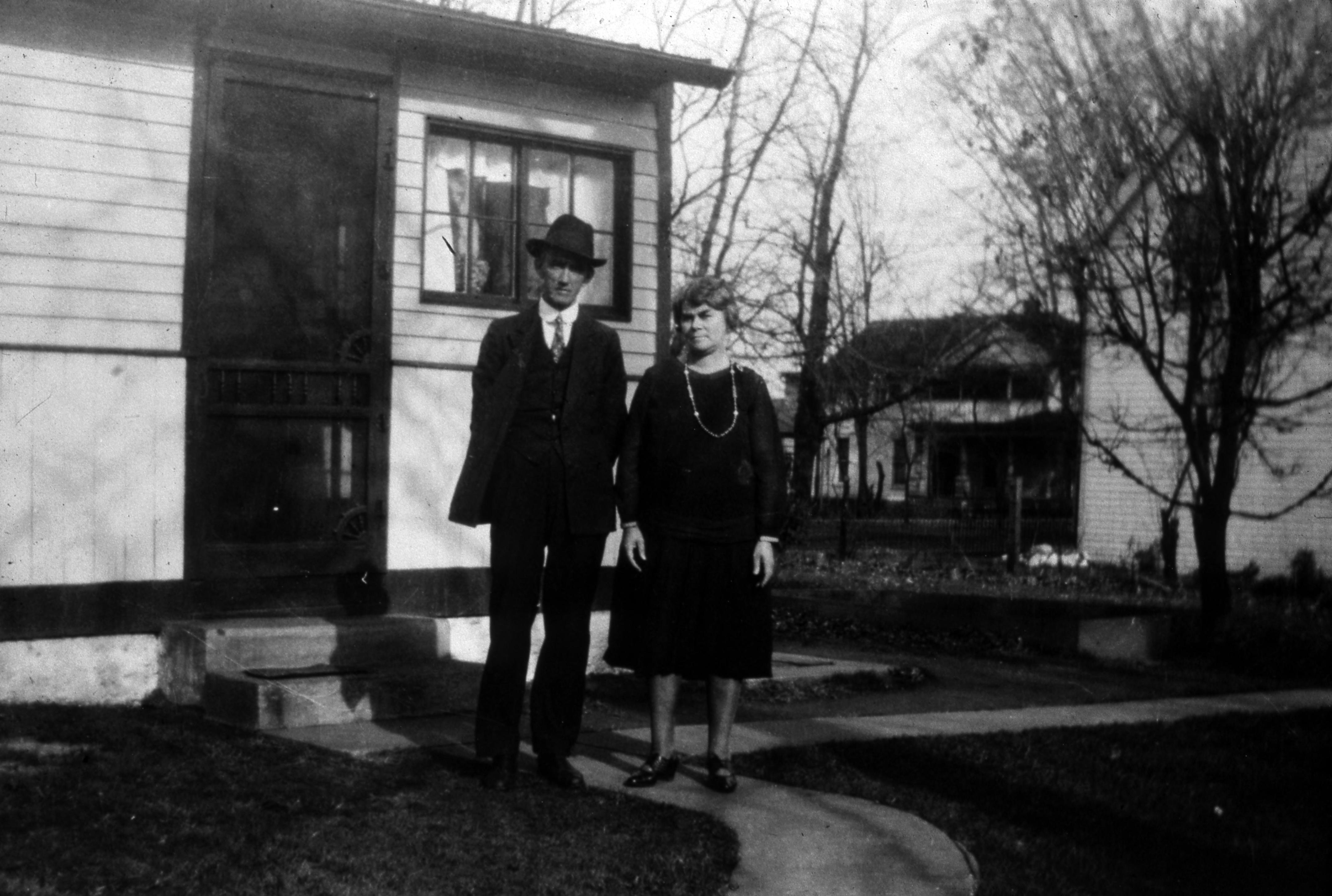 Charlie Chaffin: Charles Lycurgus Chaffin was born in New Harmony on January 6, 1881 to John Horatio Chaffin and Edith Applegate Chaffin. He had two wives Clara E. Baechle Chaffin, whom he married on October 14, 1903 until her death on September 8, 1933. They had a daughter named Gladys Catherine Chaffin Alsop. His second wife was Audrey Beard Chaffin, who was two years behind his daughter Gladys in high school. By the age of 19 he had begun tending bar for his father's establishment, and by the age of 29 he taken over his father's saloon. Their establishment was probably on either Church Street or Main Street. Charles Passed away on November 30, 1955 and is buried in Maple Hill Cemetery. This photo shows Charles on the left and, probably, Clara on the right. The photo was likely taken at their home on Church Street.