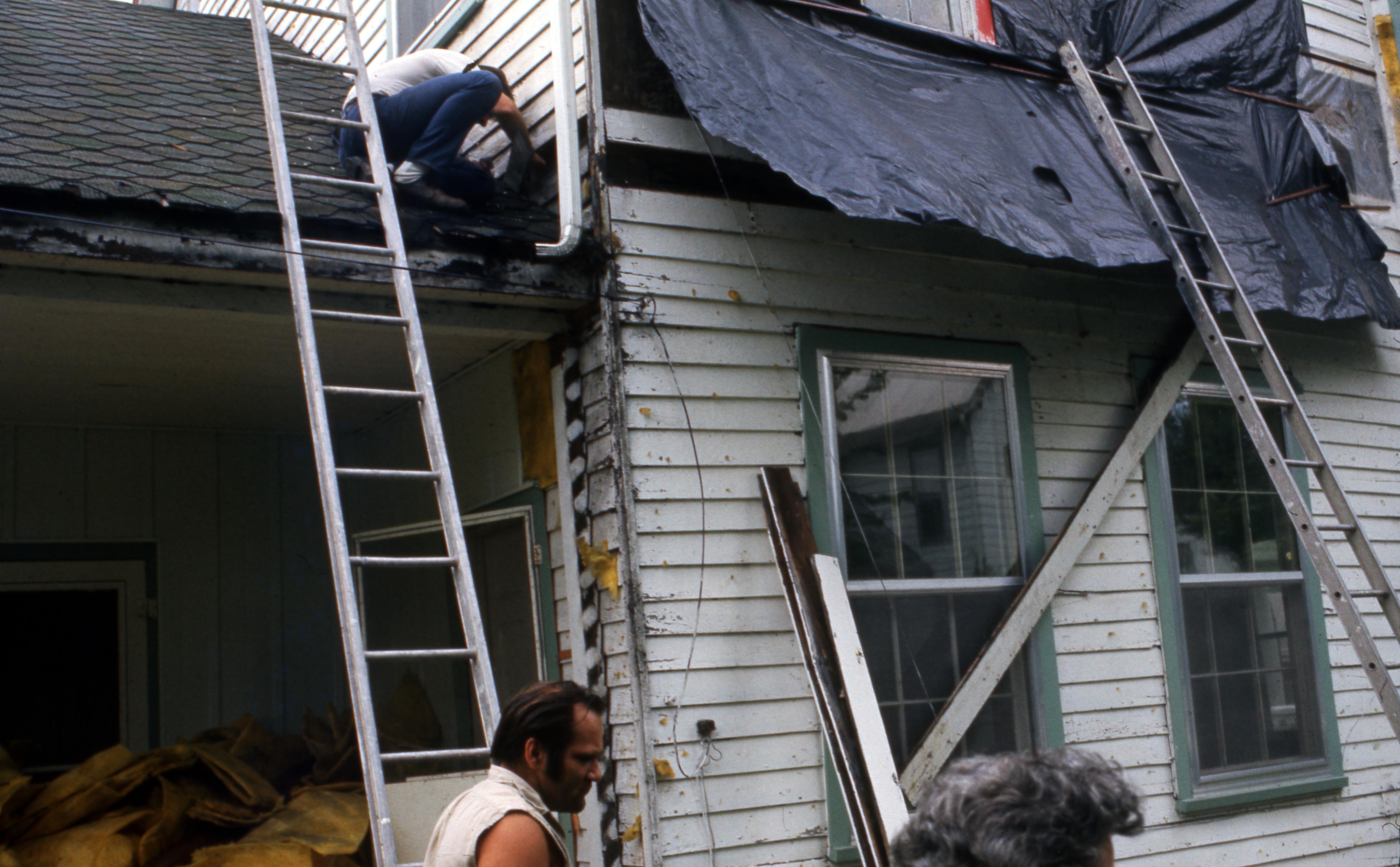Golden House: This building was moved from the plat of 807 Church, what is now 811 Church Street, to one plat west of 723 E. Church Street but has since been demolished, most likely when the house at 707 E. Church was built in 2009. Elmer Buchta Moving Engineers was contracted for this and many other building moves during the 1970s. This photo shows two construction workers removing old clapboards from one of the walls before the house was moved to the new location.