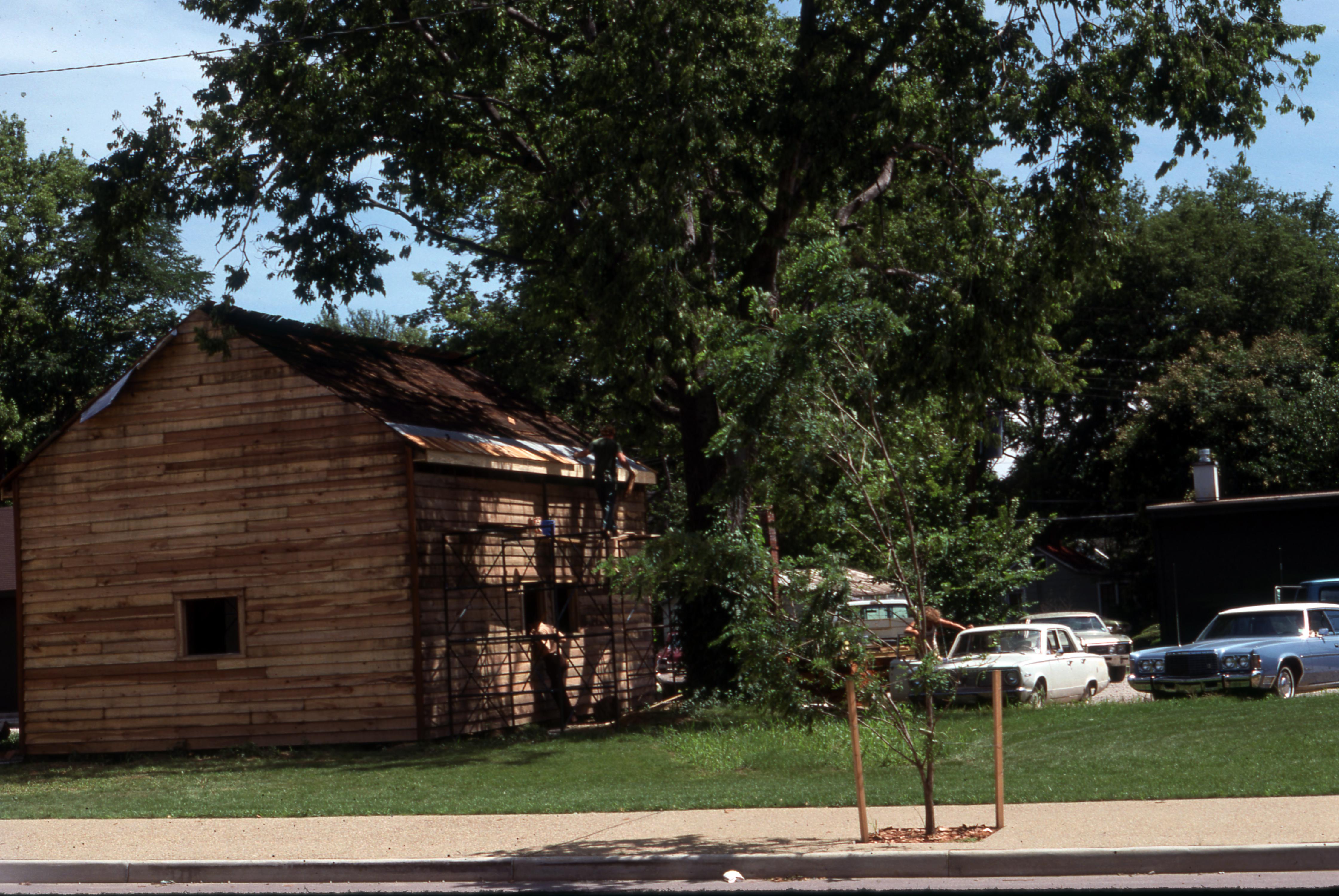 Kemmerling House: The Kemmerling House was relocated from town Block 4 J/SE to the new location at 611 Church Street, beside the Beal House. The Kemmerling House was remodeled into the 1850s Doctor's Office, a gift to the town of New Harmony from Mead Johnson. The Kemmerlings were listed in the 1882 Posey County Directory (as Kimmerlin) as being New Harmony Township farmers. Elmer Buchta Moving Engineers was contracted for this and many other building moves during the 1970s. This photo shows two construction workers installing a new cedar shake roof on the house.