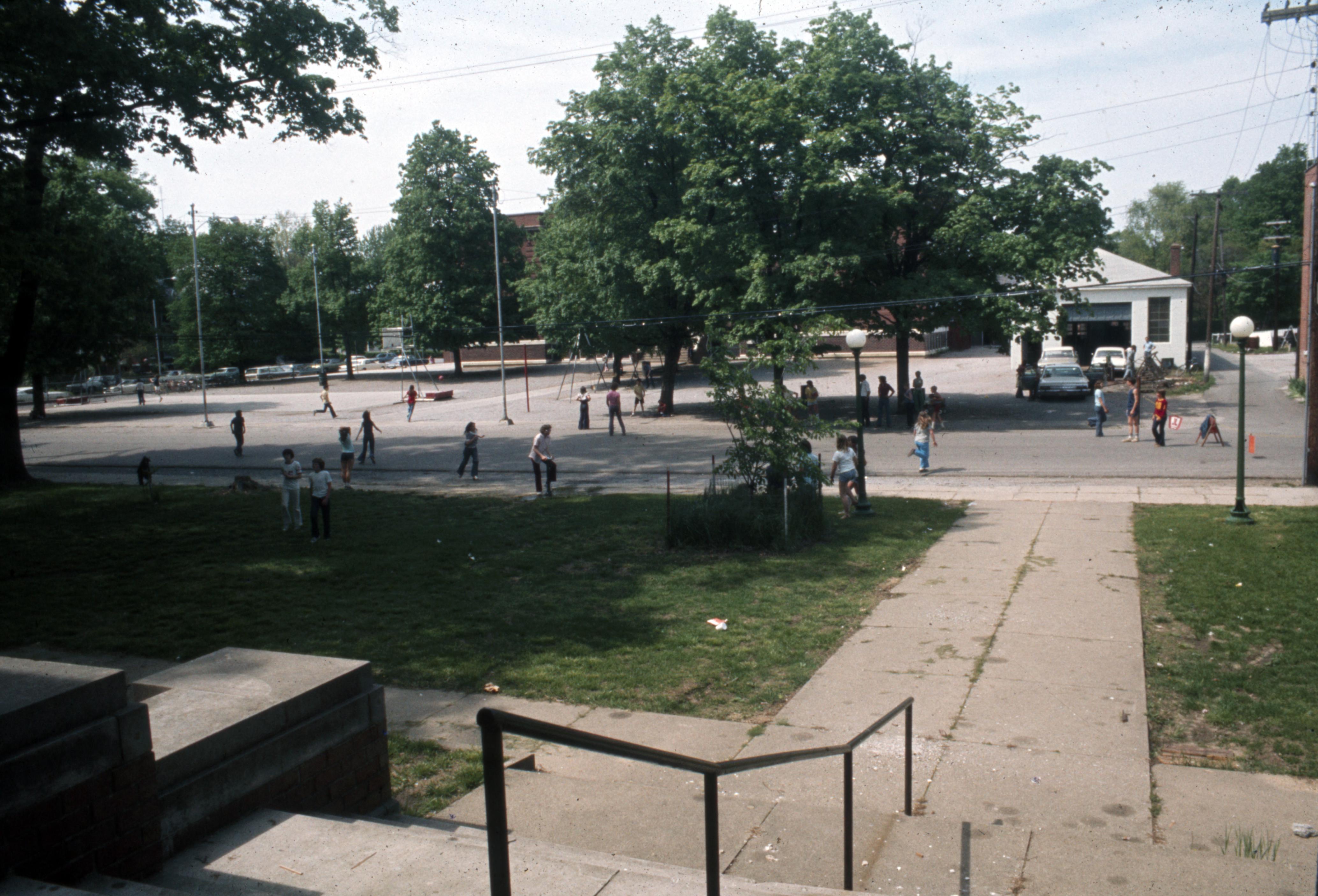 Murphy Auditorium: Murphy Auditorium is located at 419 Tavern Street and was constructed on the plat just east of the Working Men's Institute from 1911 to 1913, using the Doctor Edward Murphy Fund, and was built as part of New Harmony's centennial celebration of 1914. In 2014, the town's bicentennial, Murphy Auditorium became the new home of the concert series Under The Beams, originally housed in the Rapp-Owen Granary. Today, the auditorium is owned by the University of Southern Indiana and is the home of The New Harmony Theater with a seating capacity of 360 people. This is a view of New Harmony School, just north of Murphy Auditorium, as seen from the steps of the auditorium.