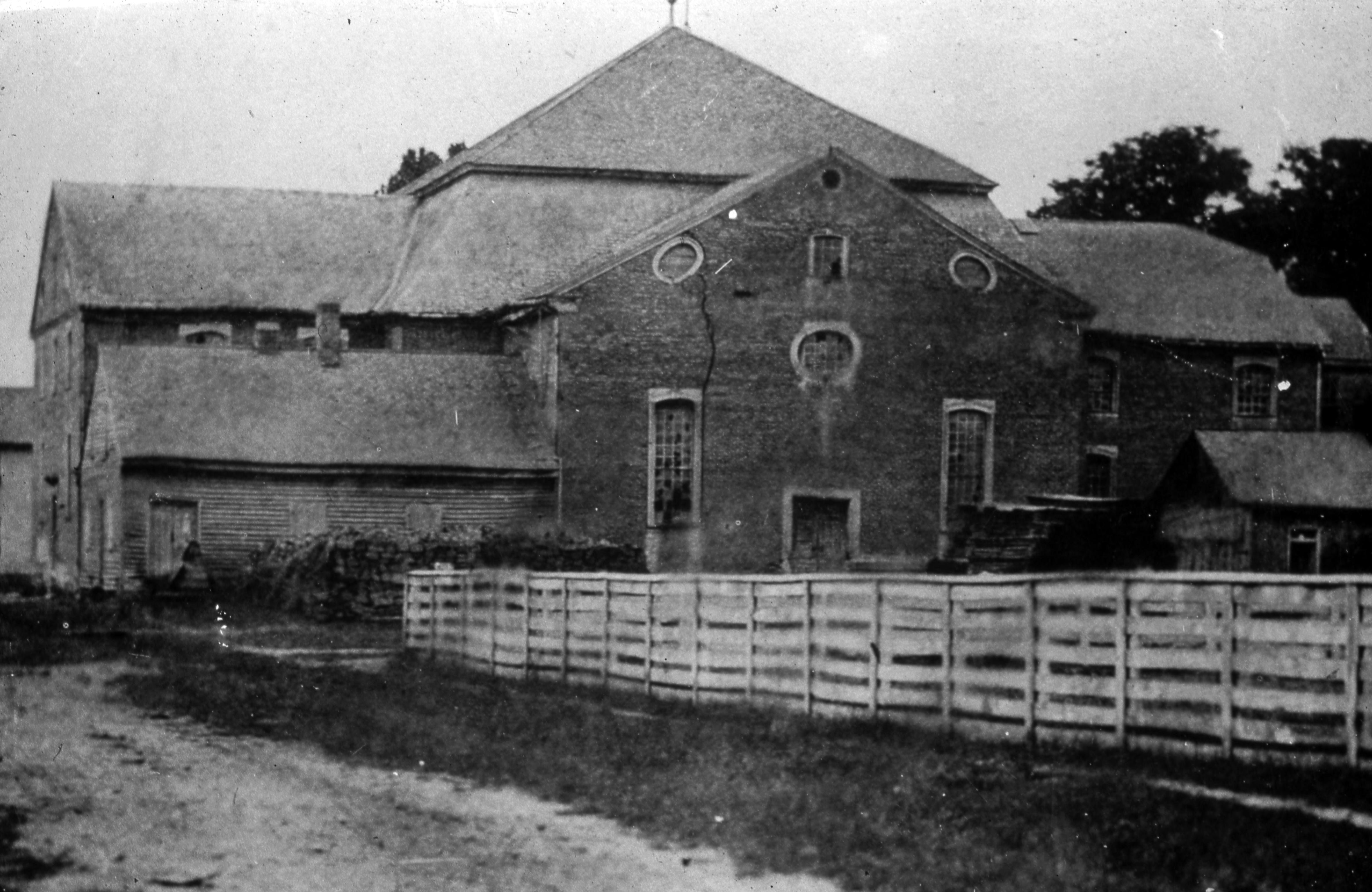 Historic Photos Collection: This is a photo of the old Rappite Brick Church from the west side. The photo was taken before 1873 when it was partially demolished to create the Old New Harmony School.