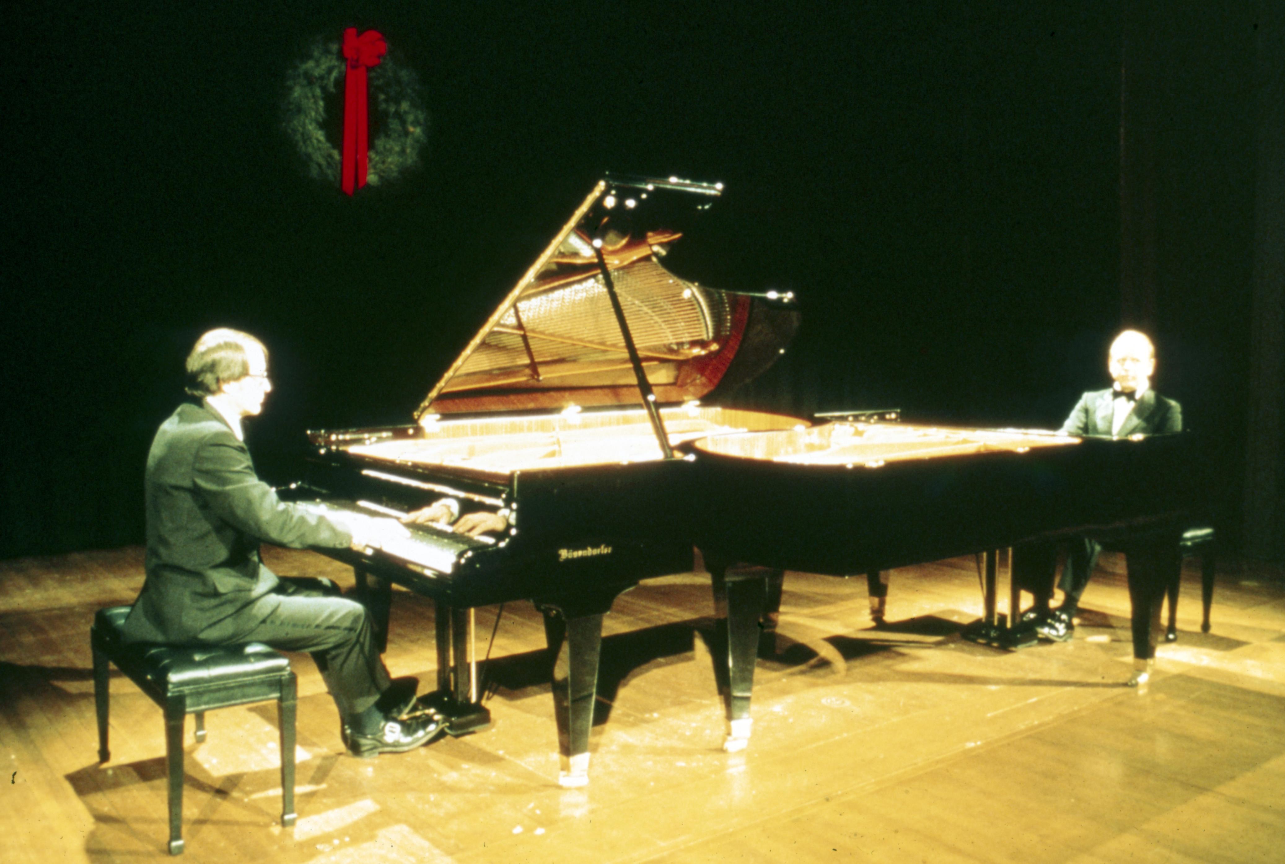 Murphy Auditorium: Murphy Auditorium is located at 419 Tavern Street and was constructed on the plat just east of the Working Men's Institute from 1911 to 1913, using the Doctor Edward Murphy Fund, and was built as part of New Harmony's centennial celebration of 1914. In 2014, the town's bicentennial, Murphy Auditorium became the new home of the concert series Under The Beams, originally housed in the Rapp-Owen Granary. Today, the auditorium is owned by the University of Southern Indiana and is the home of The New Harmony Theater with a seating capacity of 360 people. This photo is of a duel piano concert with two grand pianos facing one another. Note the holiday wreath on the wall in the background.