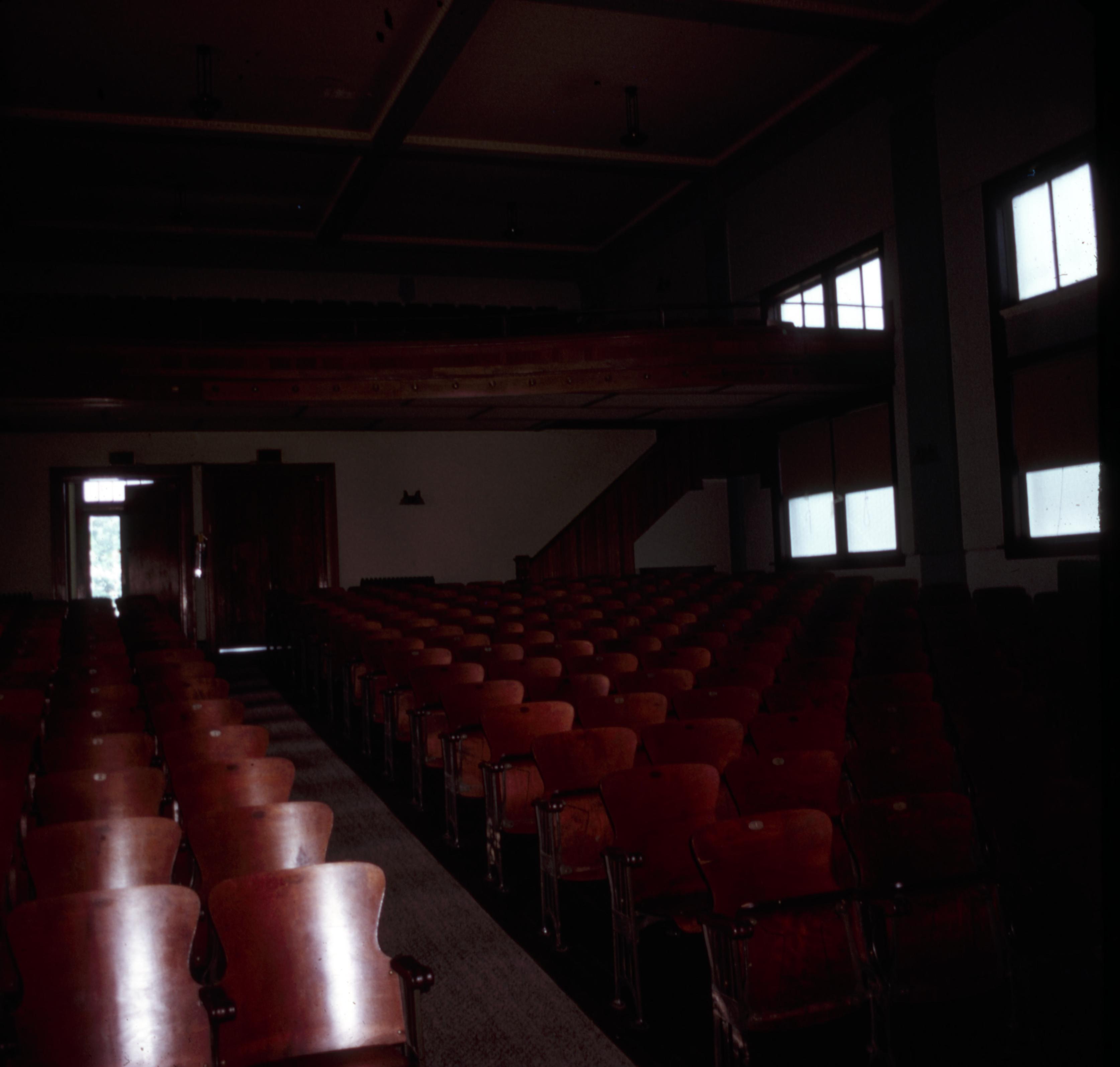 Murphy Auditorium: Murphy Auditorium is located at 419 Tavern Street and was constructed on the plat just east of the Working Men's Institute from 1911 to 1913, using the Doctor Edward Murphy Fund, and was built as part of New Harmony's centennial celebration of 1914. In 2014, the town's bicentennial, Murphy Auditorium became the new home of the concert series Under The Beams, originally housed in the Rapp-Owen Granary. Today, the auditorium is owned by the University of Southern Indiana and is the home of The New Harmony Theater with a seating capacity of 360 people. This is the interior of the auditorium. Note the original wooden seats still present.