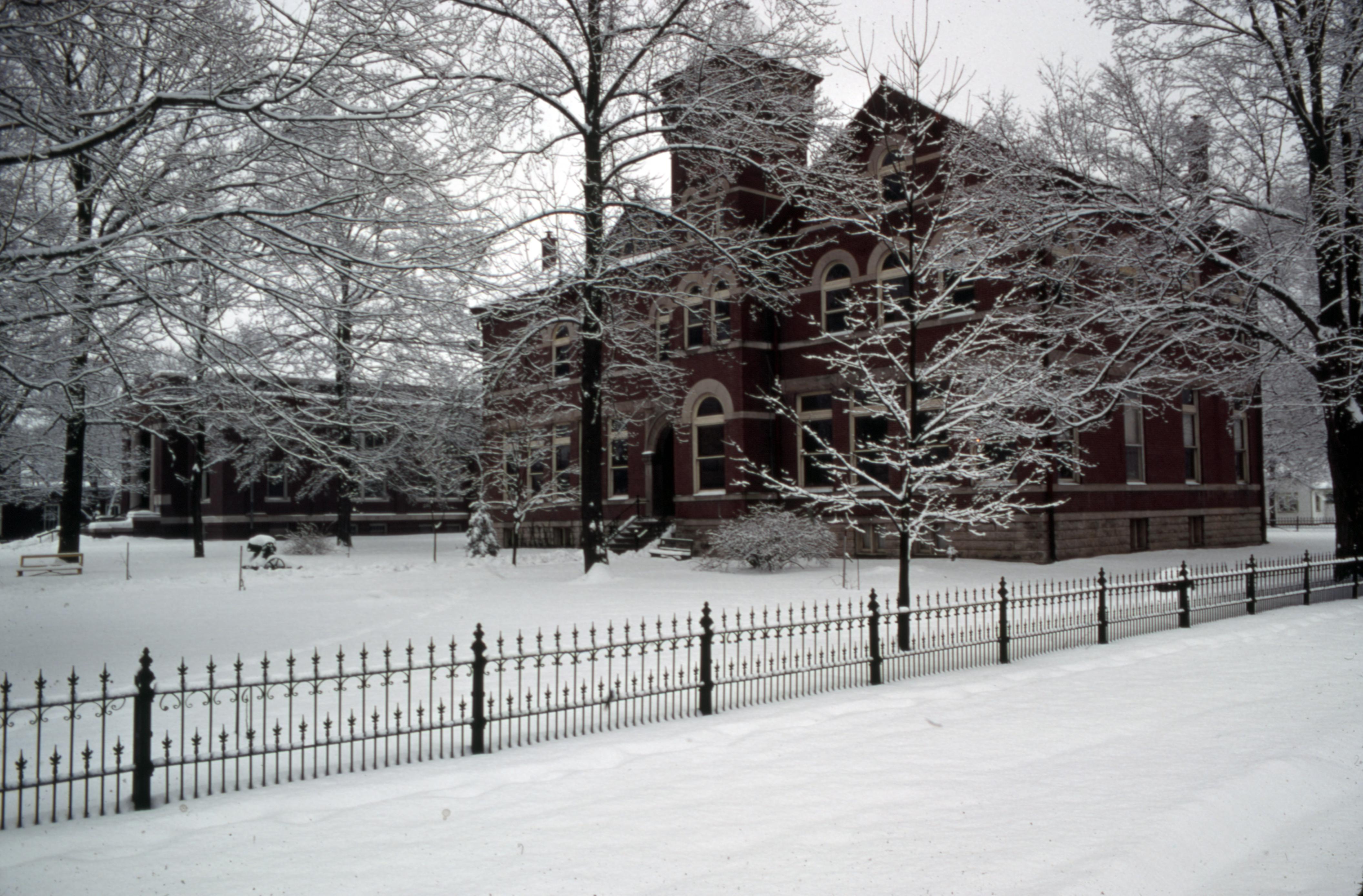 Working Men's Institute: This building is located 407 Tavern Street. The Working Men's Institute was founded in 1838, by William Maclure, as a library for working people, not just those who were wealthy. Initially there were a total of 160 Working Men's Institutes, 144 in the state of Indiana and 16 in the state of Illinois, however, the one in New Harmony Indiana is the only one which still remains. The present location of the WMI was completed in 1894, now a National Historic Landmark, before this it was housed in the old Harmonist Church from 1834 until the new building was completed. The WMI also houses a museum as well as the oldest working library in the state of Indiana. This photo of the WMI, under a blanket of snow, was taken from west street and shows the northwest corner of the building. Murphy Auditorium can be seen just east of the WMI on the left of the photo.