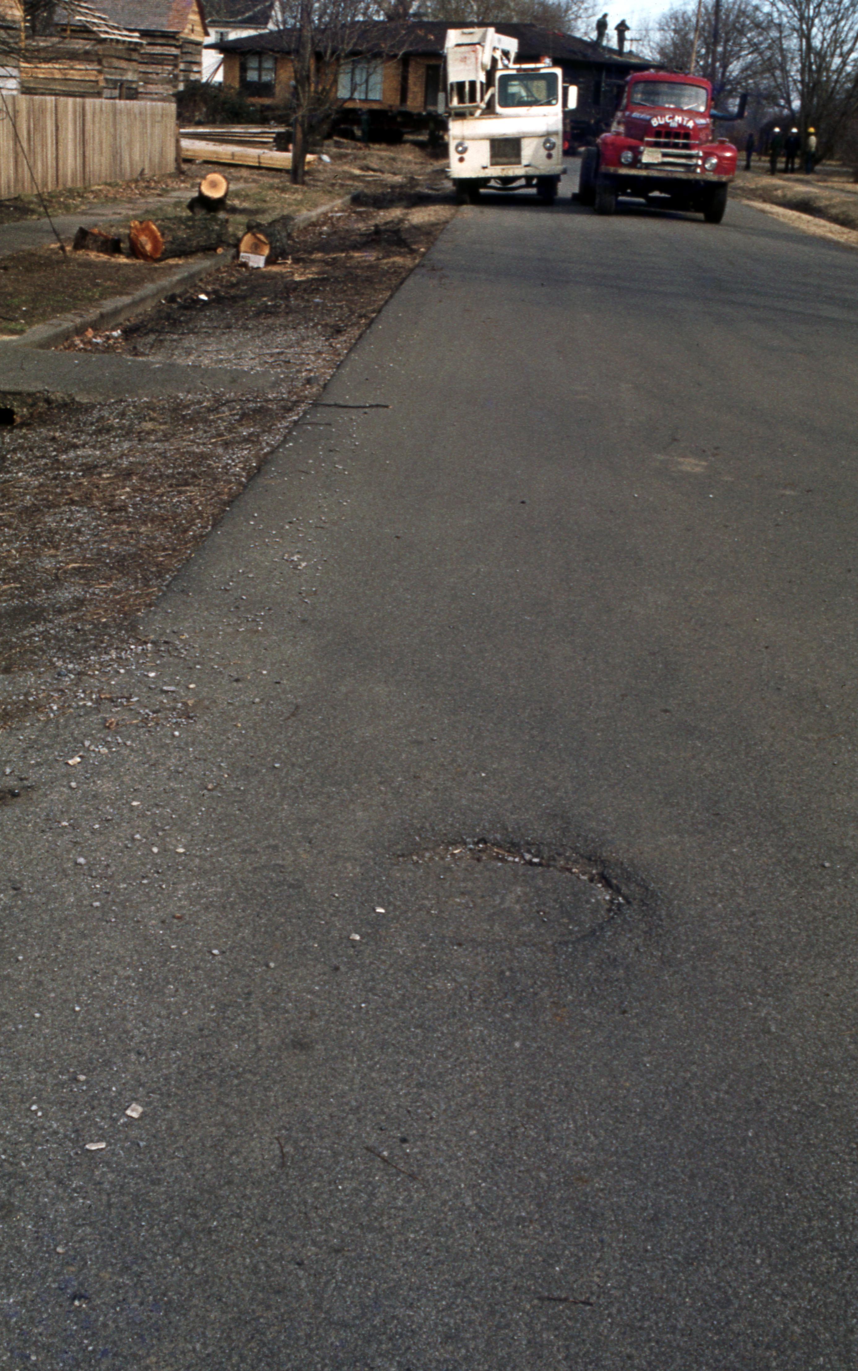 Bauer House: This house was originally located on the north side of North Street in town block 2 C/E. It was moved to the new location at 518 First Street before construction on the Atheneum had begun. Elmer Buchta Moving Engineers was contracted for this and many other building moves during the 1970s. This photo shows the house at the corner of North and West Streets. The log houses at 323 North Street, historic structures from the 1820s, can be seen on the left side of the photo.