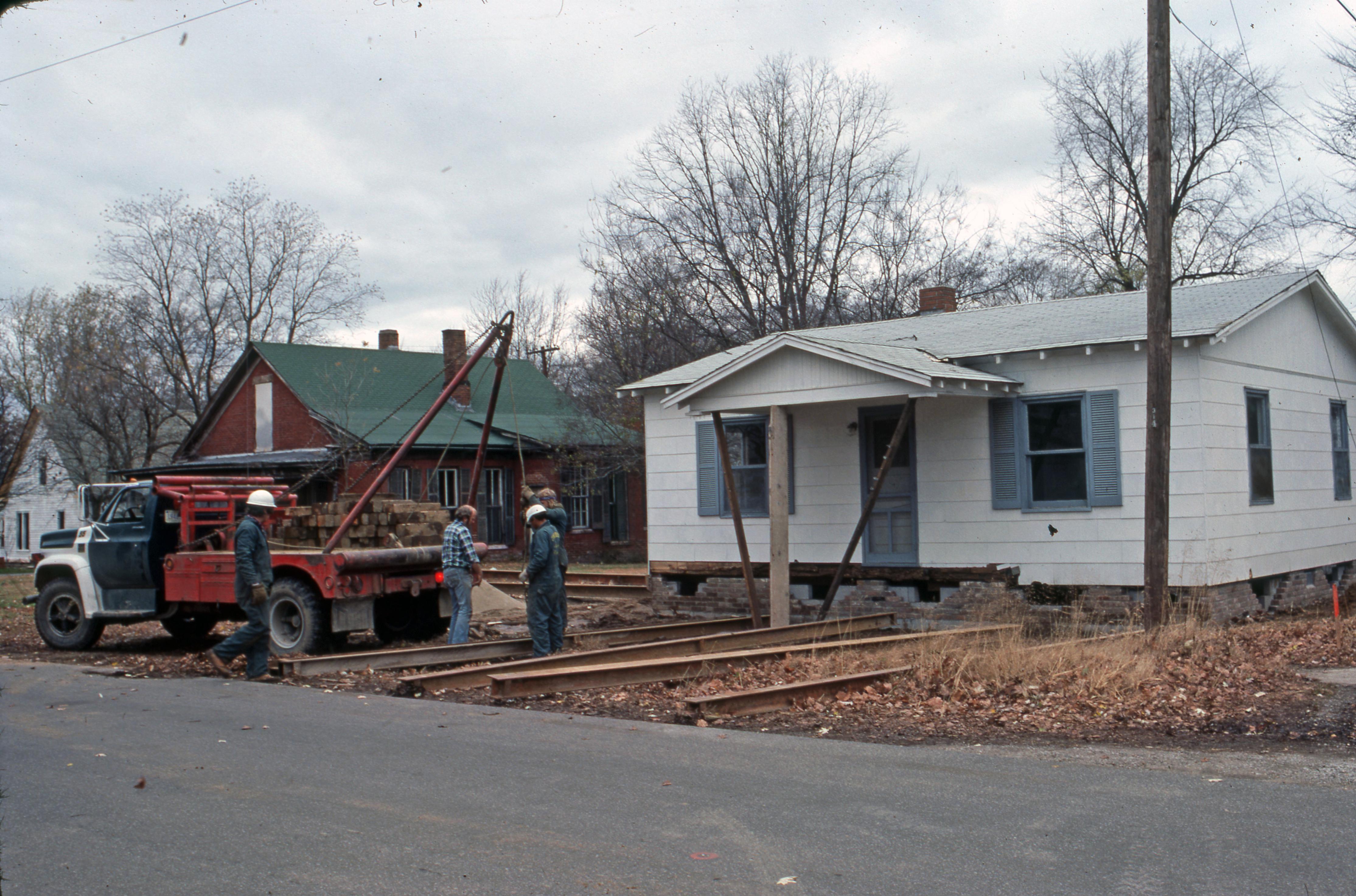 Lewis House: This small house was moved from town block 7 E/SW, one plat east of 718 Main Street, to town block 6 C/SW at 312 Steam Mill Street. It was built in 1890 and at some point after 1975 went through a major remodel after it had been moved. The house was moved by Elmer Buchta moving engineers, a company that did most if not all of the moving in New Harmony at this time. In this photo the Lewis House is sitting on the new foundations. To the left can be seen the Patterson House before renovation had been started.