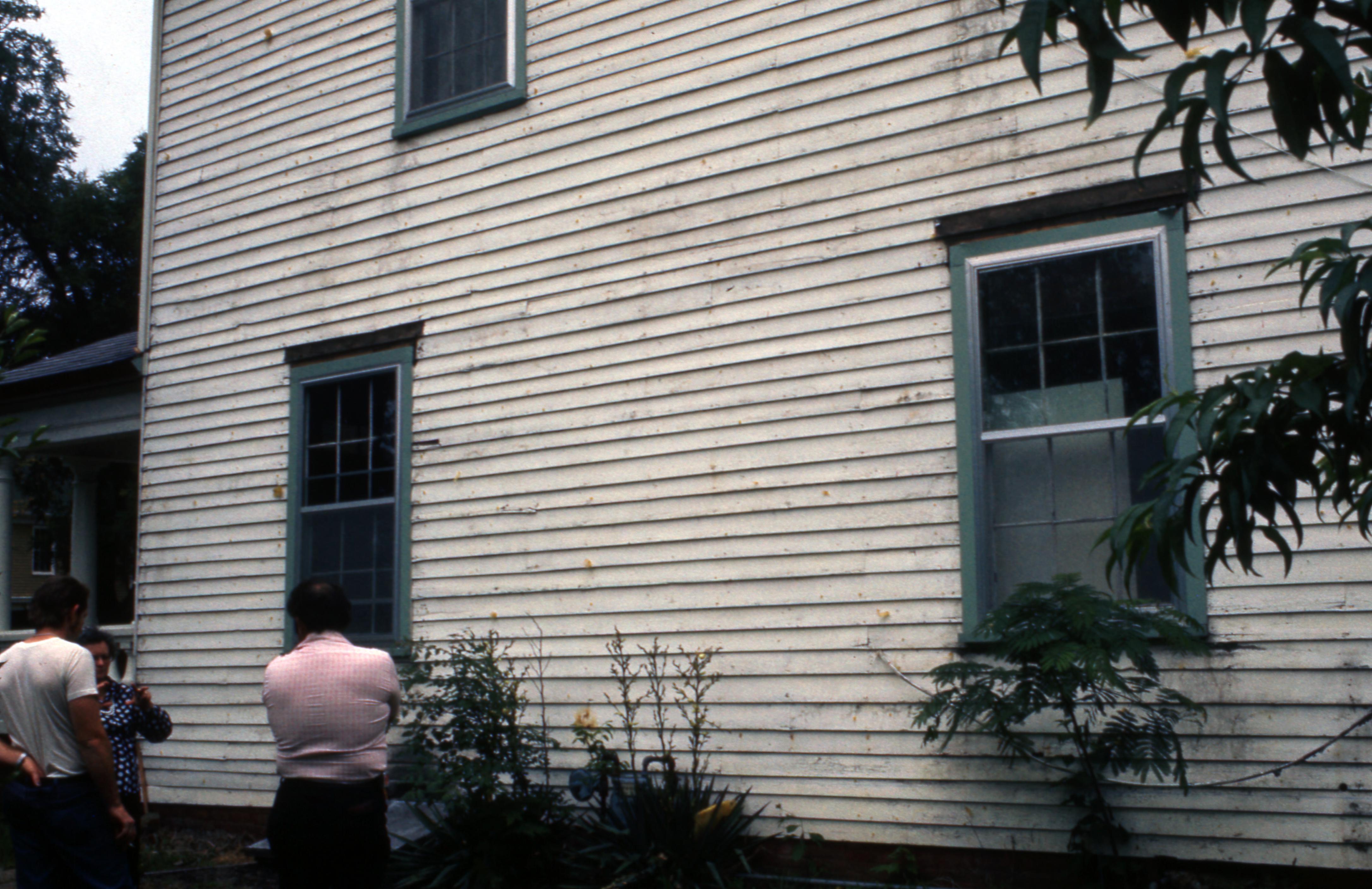 Golden House: This building was moved from the plat of 807 Church, what is now 811 Church Street, to one plat west of 723 E. Church Street but has since been demolished, most likely when the house at 707 E. Church was built in 2009. Elmer Buchta Moving Engineers was contracted for this and many other building moves during the 1970s. In this photo a group of people are standing near the east wall of the house, toward the back, possibly talking about the house move.