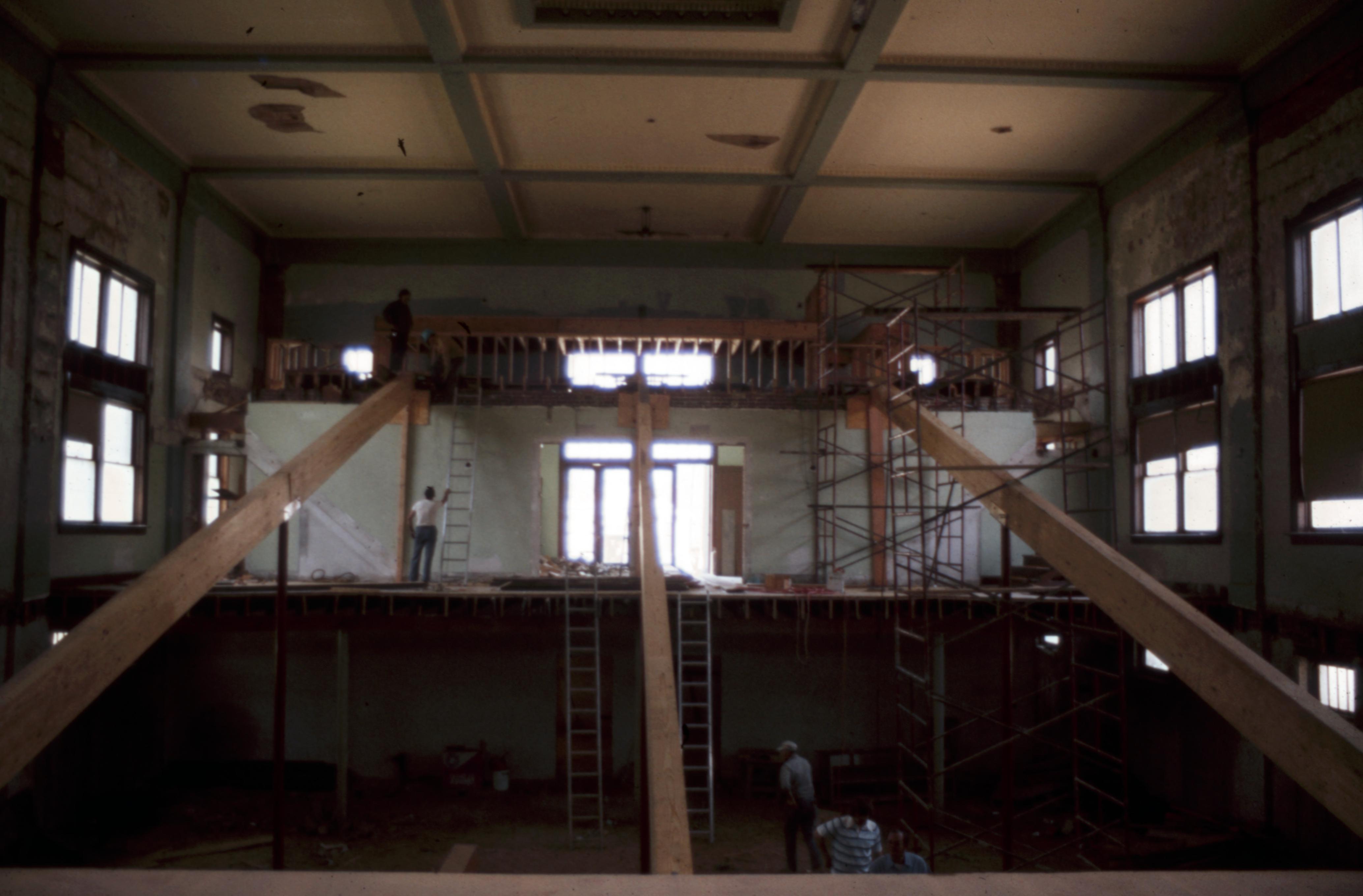 Murphy Auditorium: Murphy Auditorium is located at 419 Tavern Street and was constructed on the plat just east of the Working Men's Institute from 1911 to 1913, using the Doctor Edward Murphy Fund, and was built as part of New Harmony's centennial celebration of 1914. In 2014, the town's bicentennial, Murphy Auditorium became the new home of the concert series Under The Beams, originally housed in the Rapp-Owen Granary. Today, the auditorium is owned by the University of Southern Indiana and is the home of The New Harmony Theater with a seating capacity of 360 people. This photo is a view of the refurbish work occurring inside the auditorium.