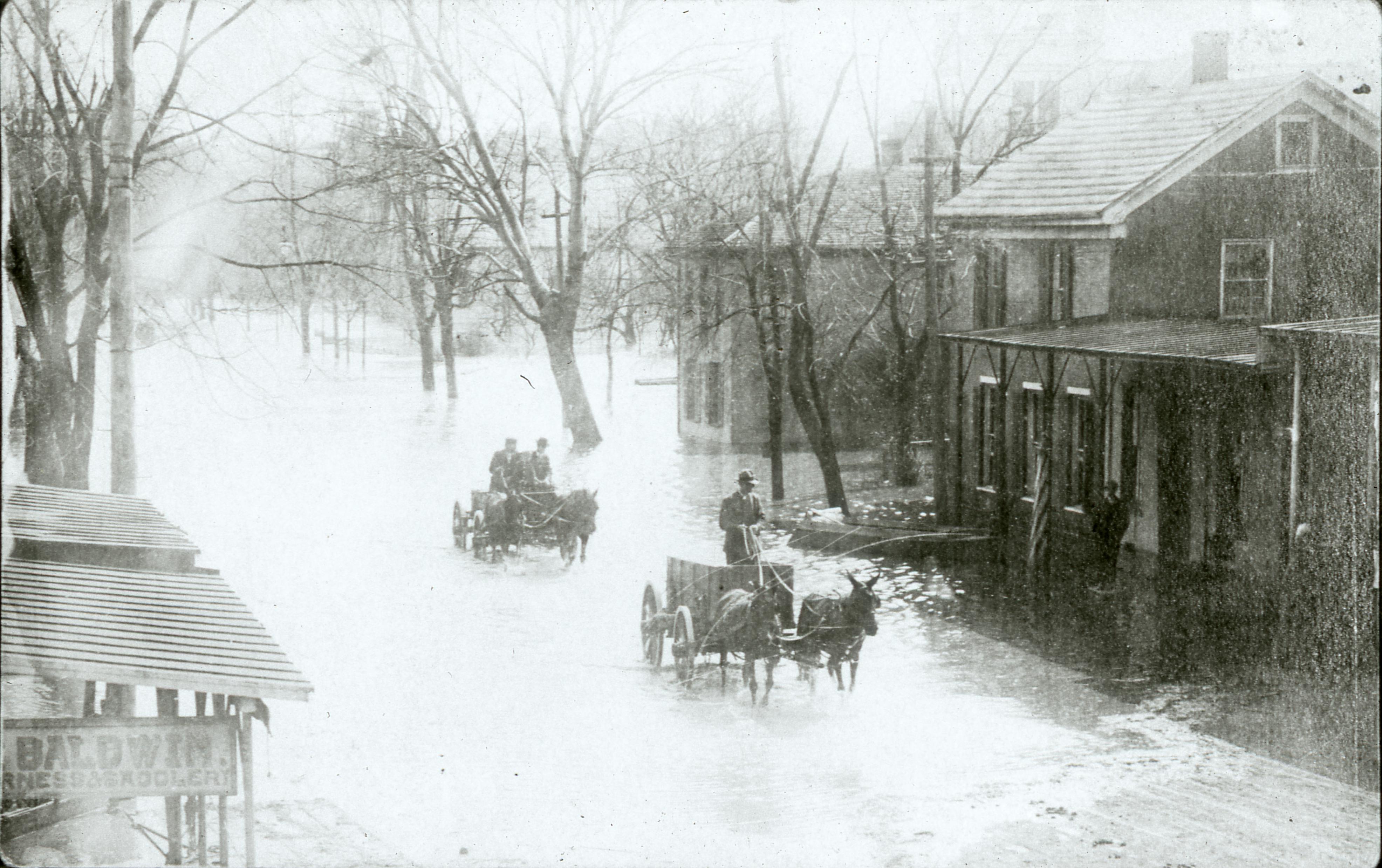 Historic Photo. Streets Collection: 1913 Flood: On March 24 and 25 of 1913 the Wabash River had produced a large flood, which inundated the town of New Harmony, from torrential rains and storms which had also produced tornados across the mid-west United States. At its height it measured 27 feet 10 inches. This photo shows the corner of Main and Tavern Streets. This was taken from the second floor of Lichtenberger�s store. The photo shows the George Baldwin/ Independent Order of Odd Fellow�s building next door.